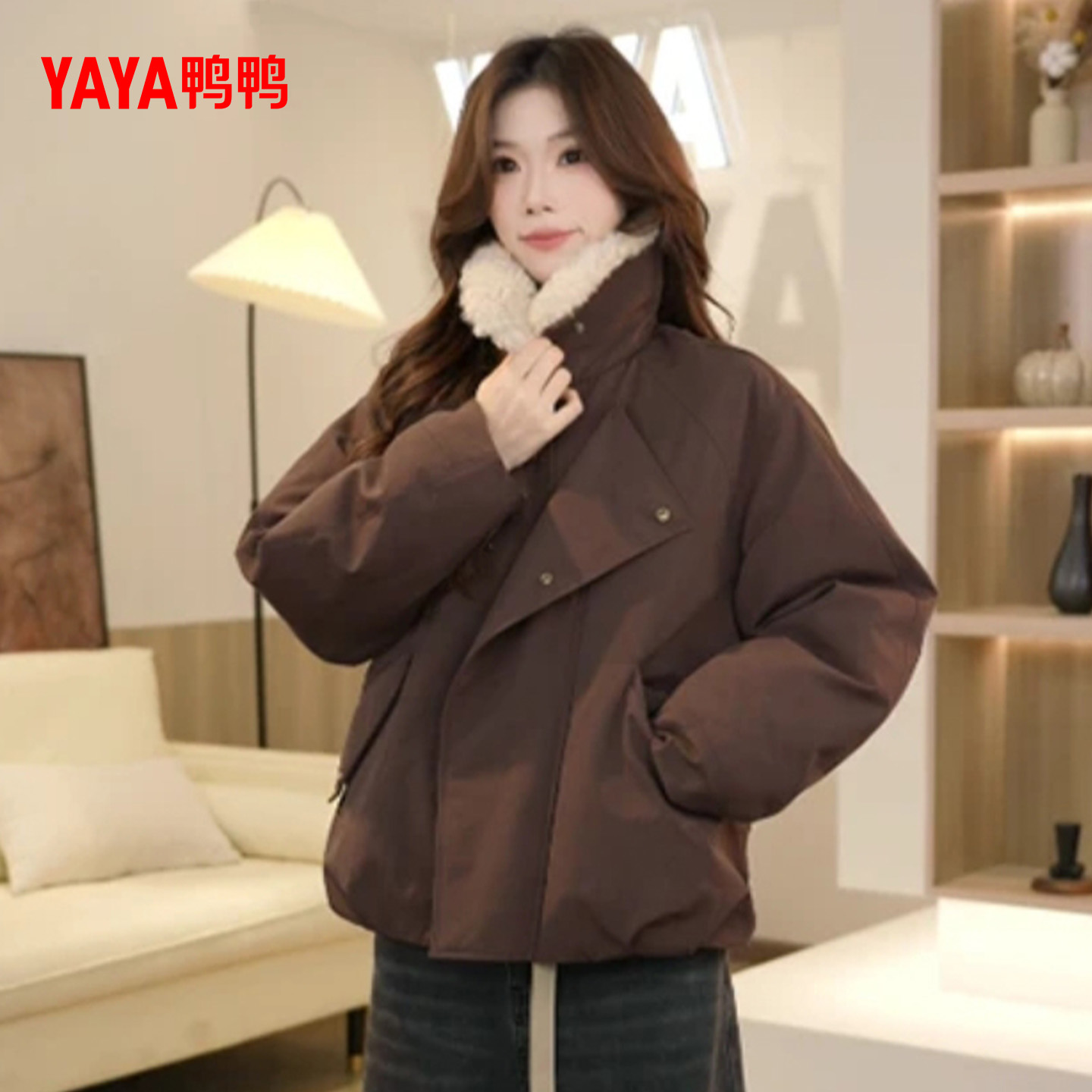 艾莱依2025新款 宽松显瘦下摆抽绳防风保暖短外套 连帽羽绒服落肩袖