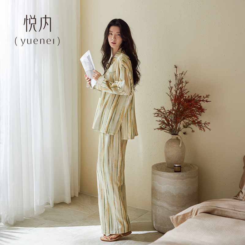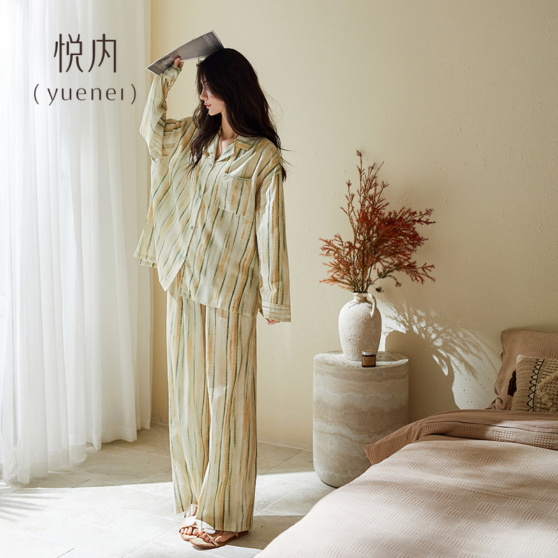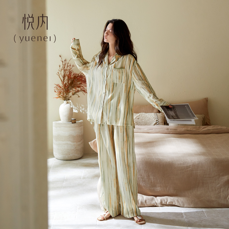 春秋季 套装 长袖 开衫 莫代尔家居服休闲慵懒大码 悦内带胸垫睡衣女款