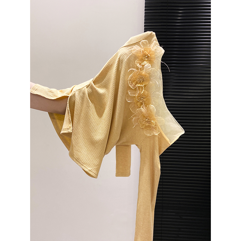 修身 t恤女2025早秋新款 显瘦设计感露肩小上衣 立体花斜领长袖 法式