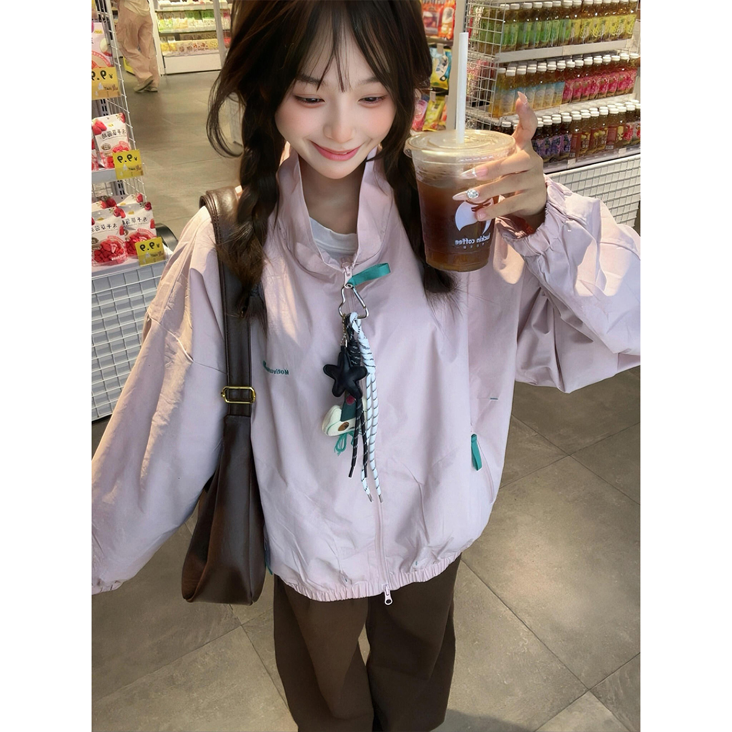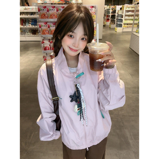 粉红色立领冲锋衣外套男女秋季 宽松运动风休闲夹克户外情侣棒球服