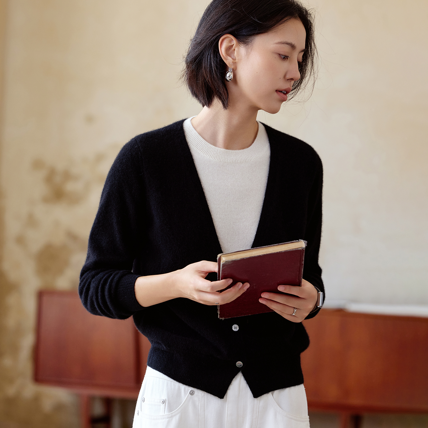 黑色羊毛针织衫 时尚 高级感山羊绒V领毛衣女MOFAN摩凡2025冬新款