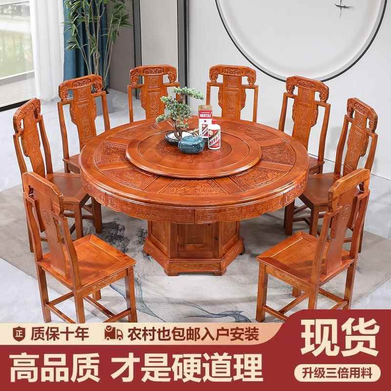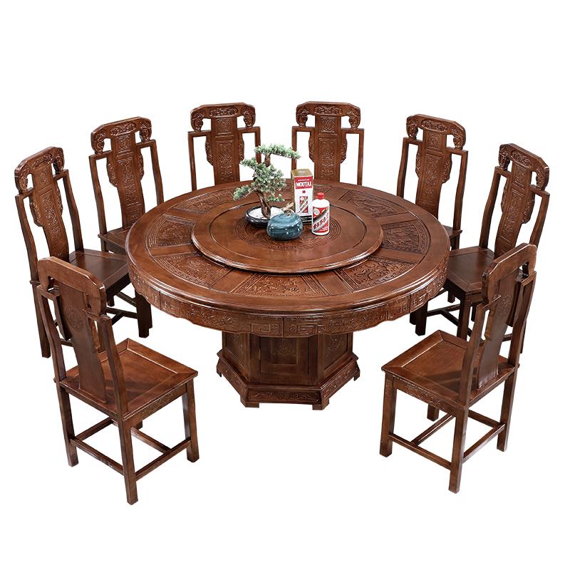 实木仿古雕花家用饭桌酒店大圆桌带转盘明清古典多尺寸餐桌花梨色