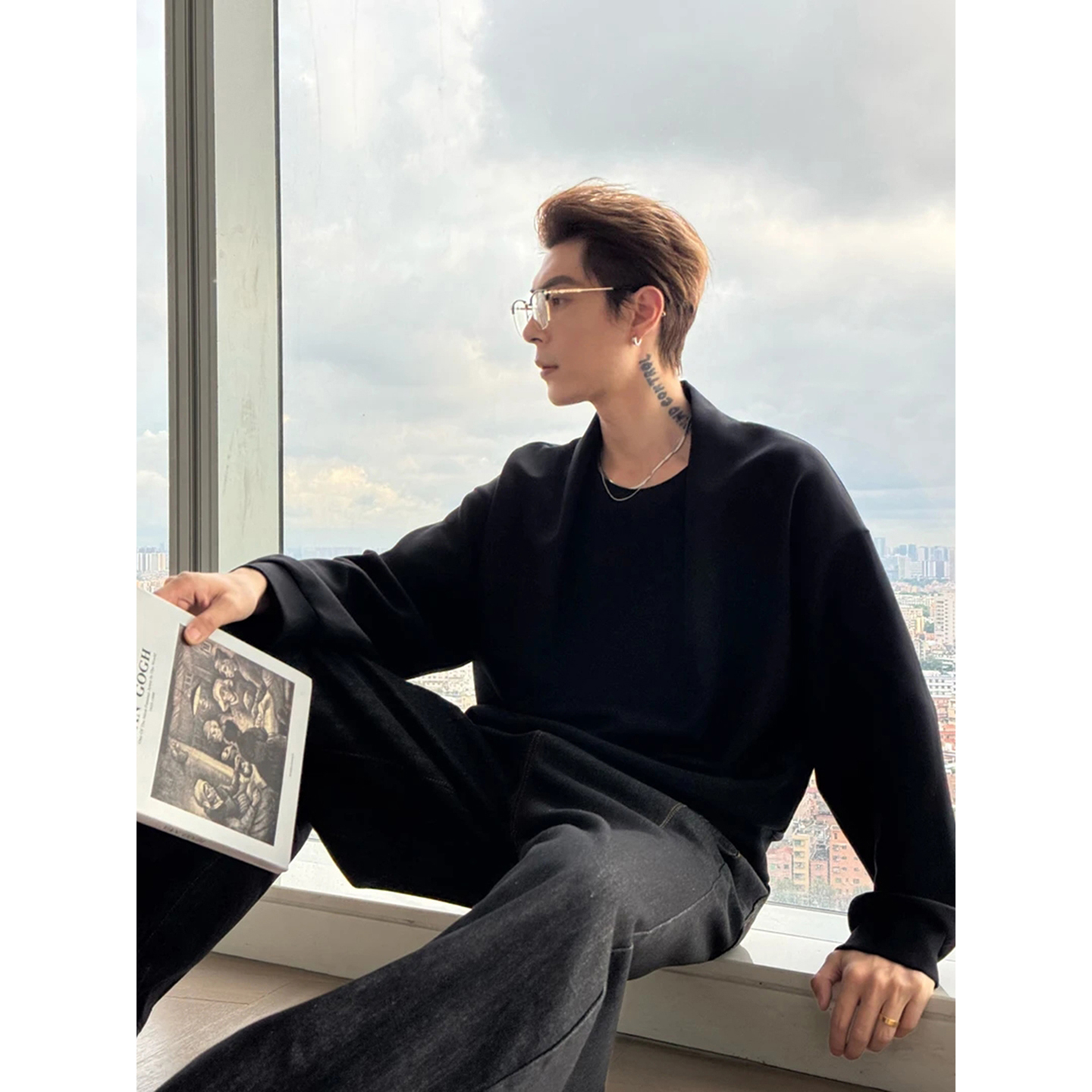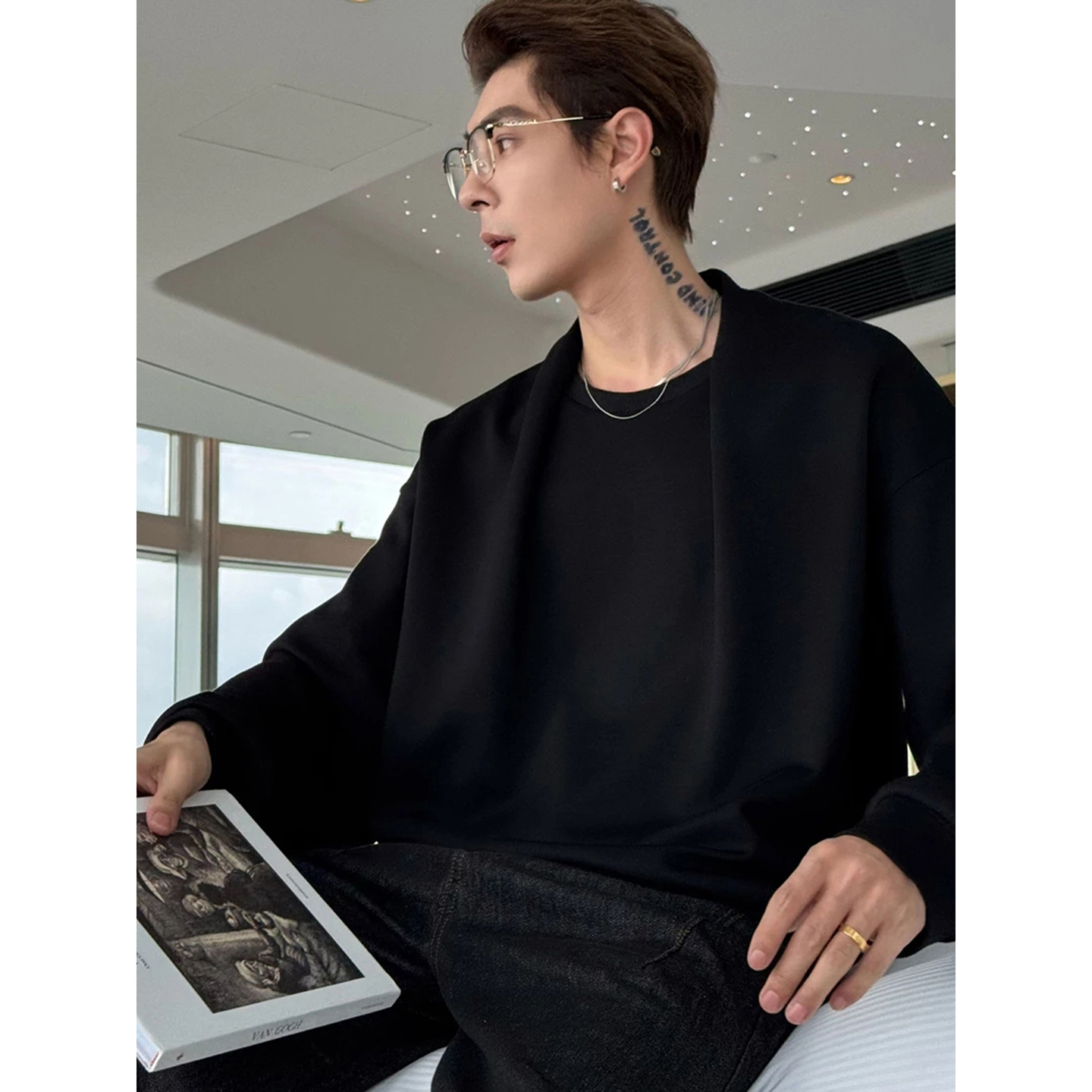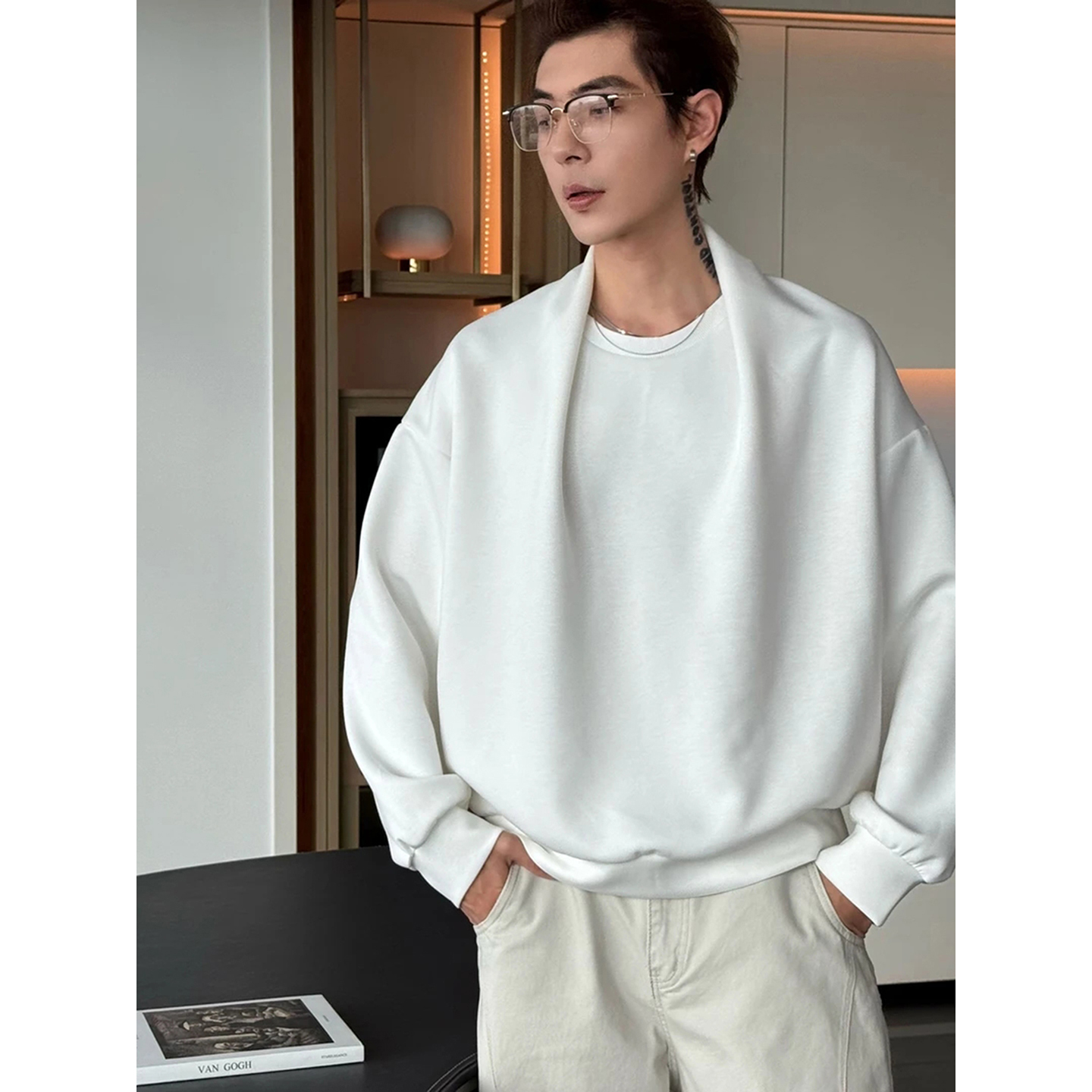 ootd穿搭重磅t恤小众内搭打底衫 设计感披肩美式 秋季 卫衣男款 长袖