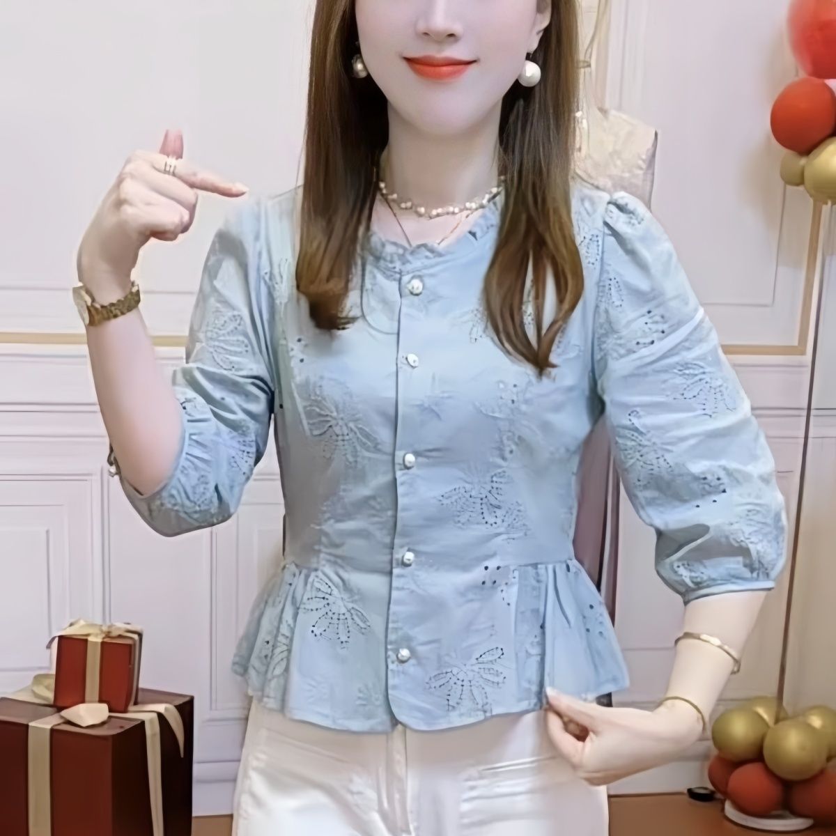 彩扣娃娃领上衣纯棉刺绣衬衣 2025春秋新款 初影杏色绣花衬衫 女长袖
