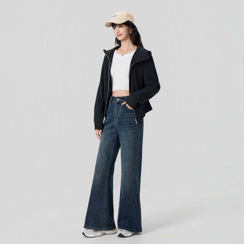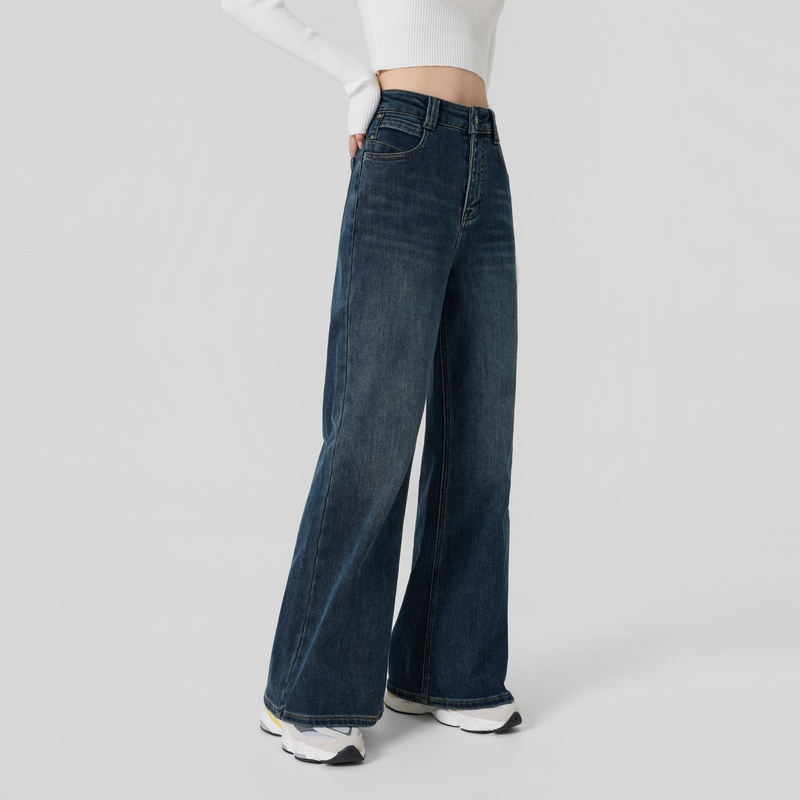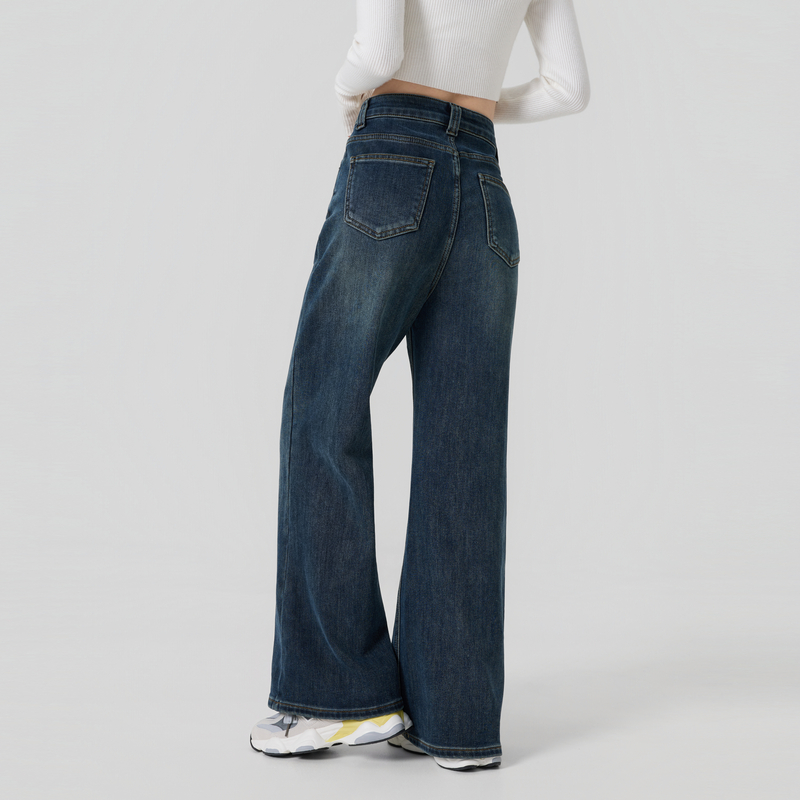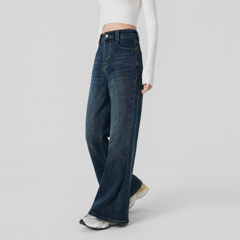女05415301 牛仔长裤 佐丹奴牛仔裤 女原色洗水复古收褶半松紧腰薄款