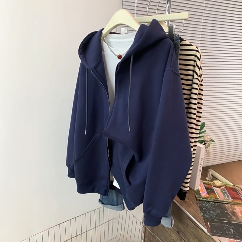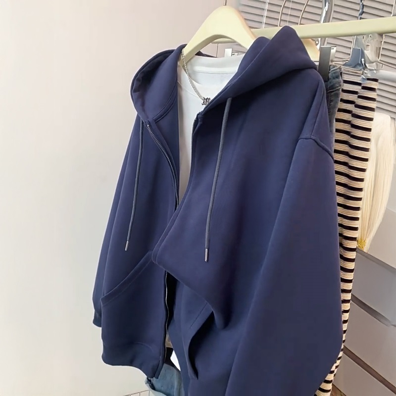 爆款 蓝色拉链连帽卫衣女2025新款 宽松上衣春秋冬外套 女装 胖mm大码