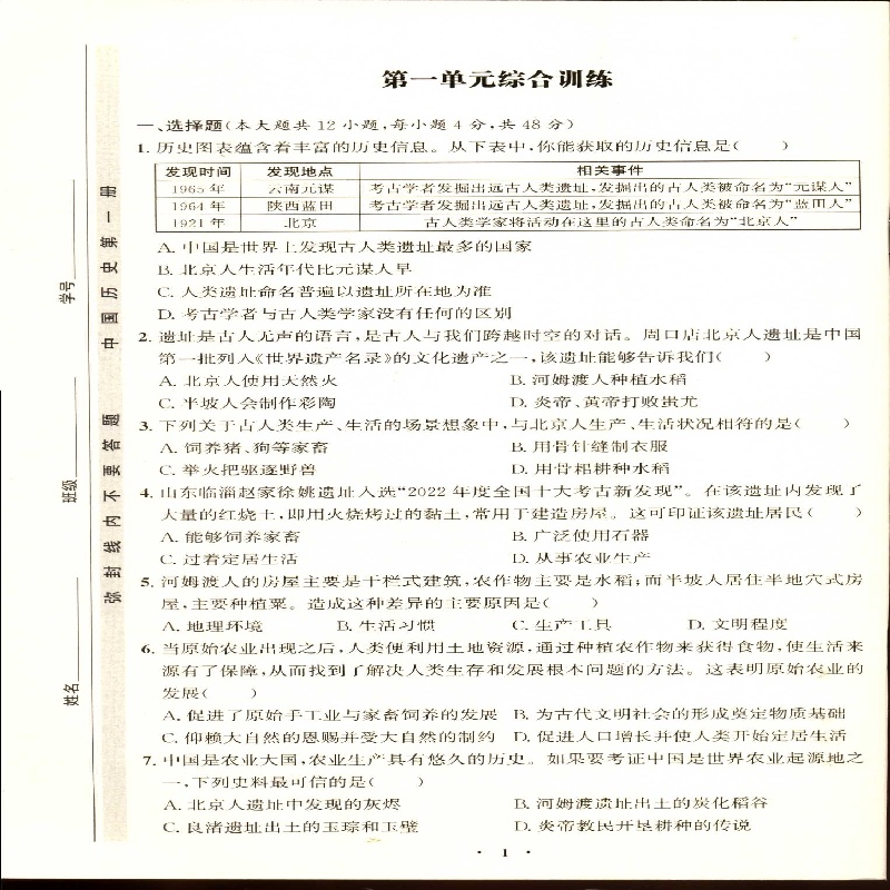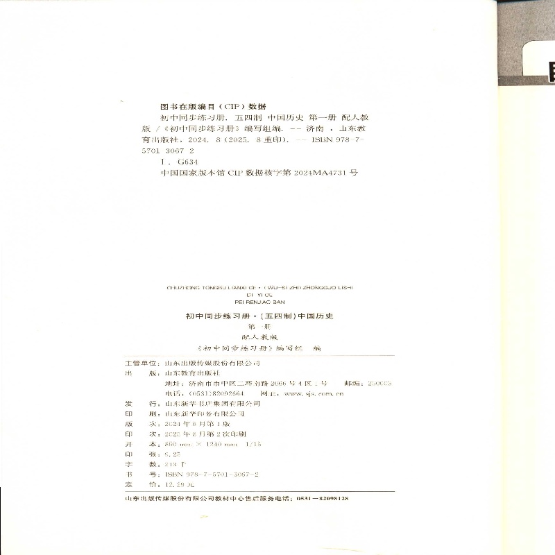 2025秋五四制6六年级上册中国历史第一册初中同步练习册山东教育出版 社配人教版