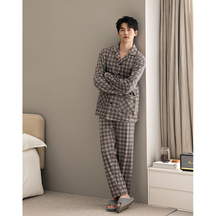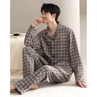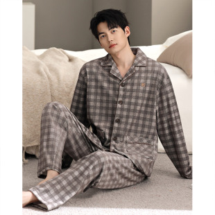 长袖 可外穿家居服套装 开衫 新款 男 纯色全棉秋冬季 雅鹿纯棉睡衣男士