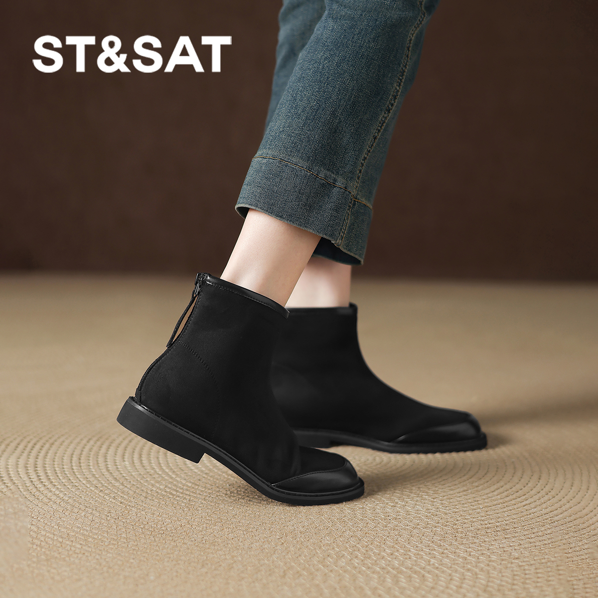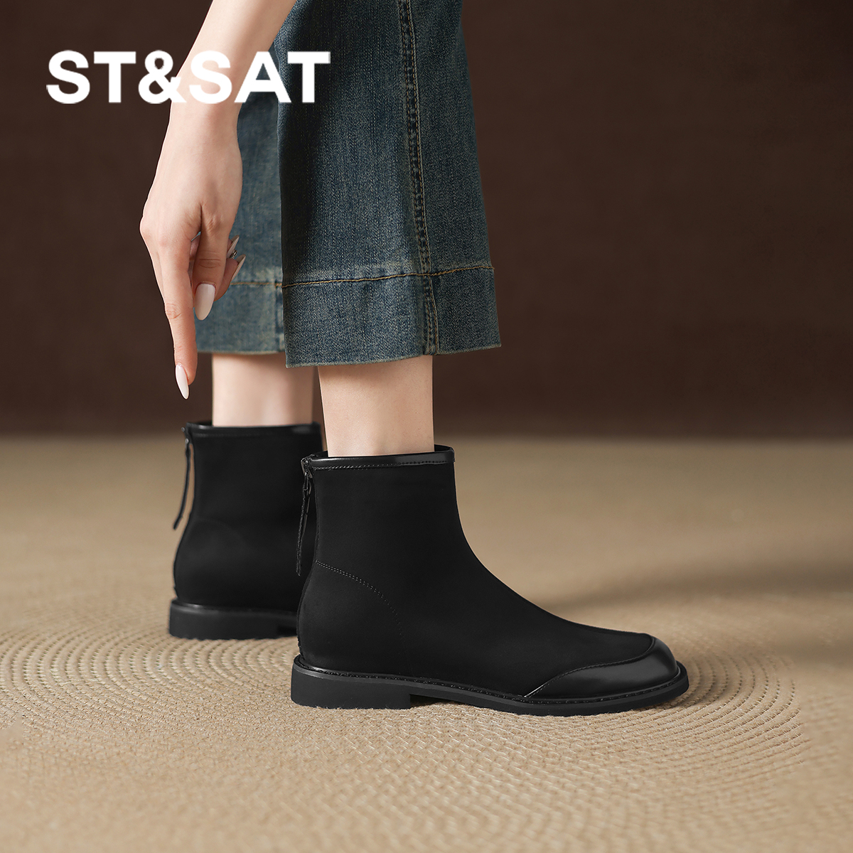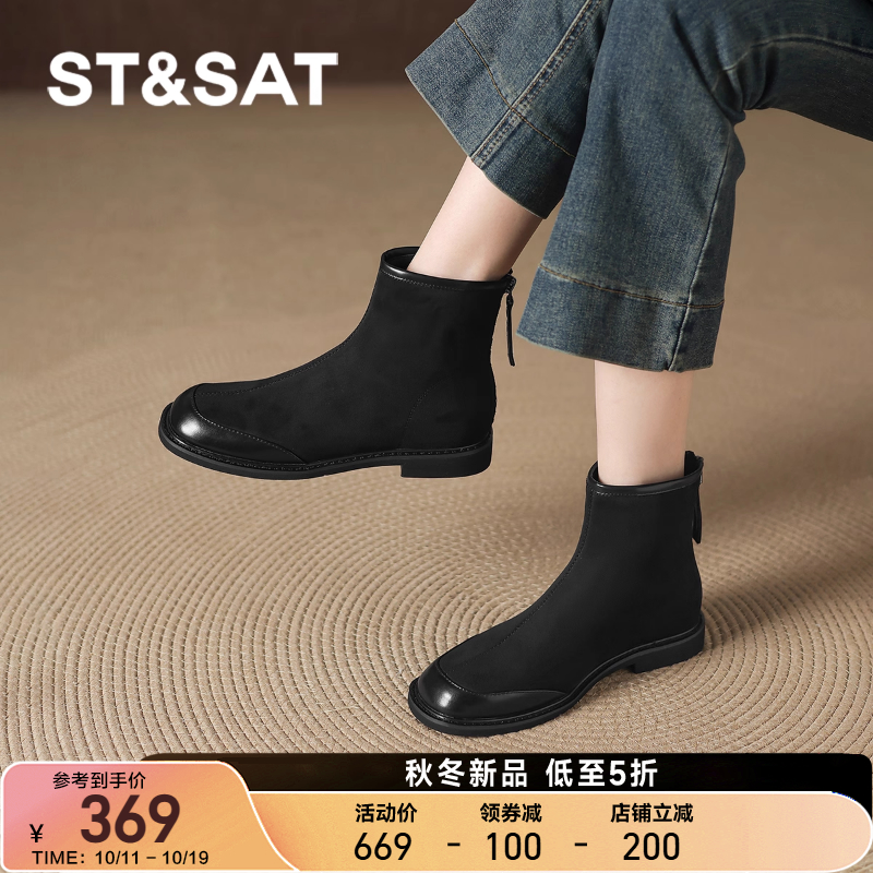 星期六短靴子2025新款 弹力短靴瘦瘦靴 黑色英伦风百搭粗跟平底爆款