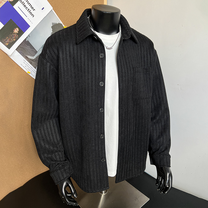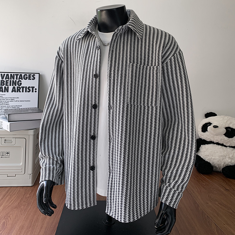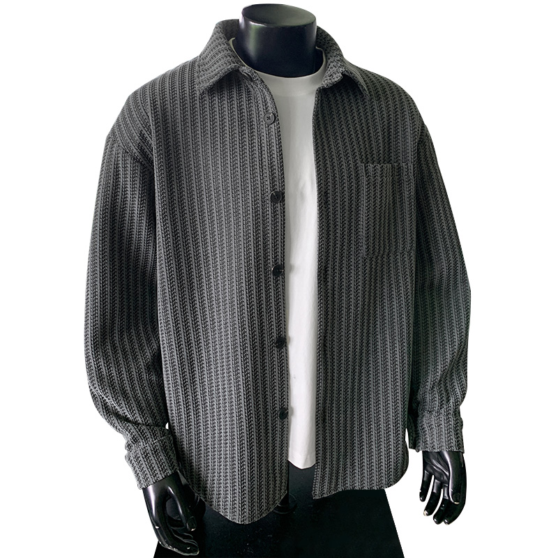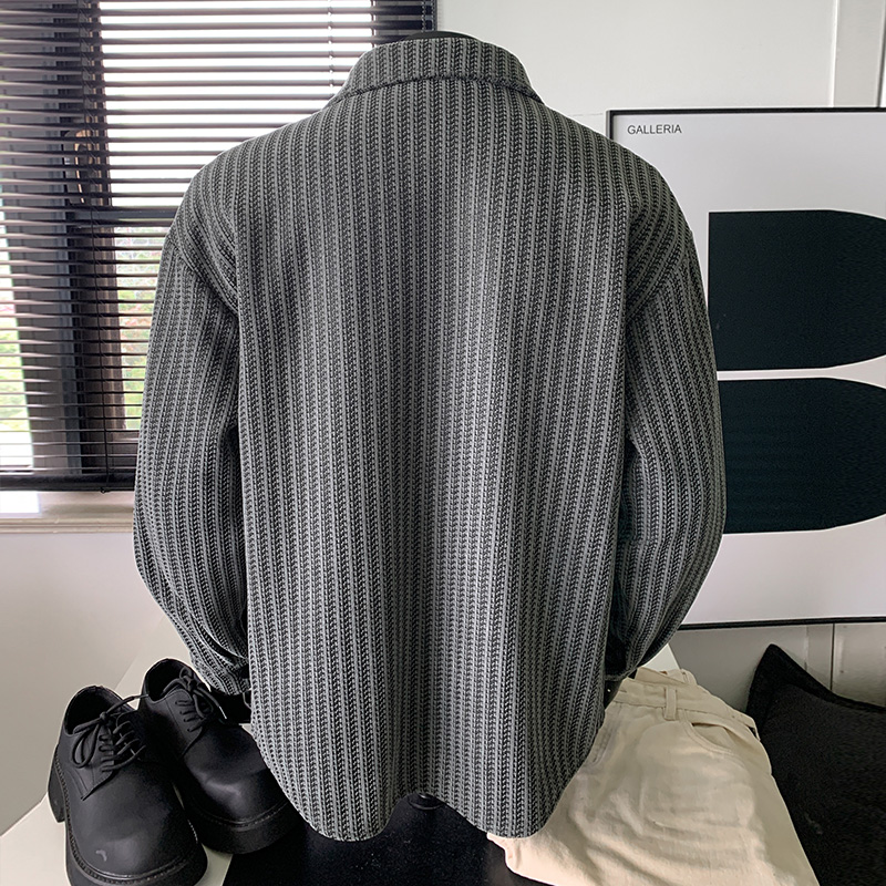 复古潮流大码 罗蒙条纹衬衫 美式 秋季 宽松休闲肌理感衬衣外套 男长袖