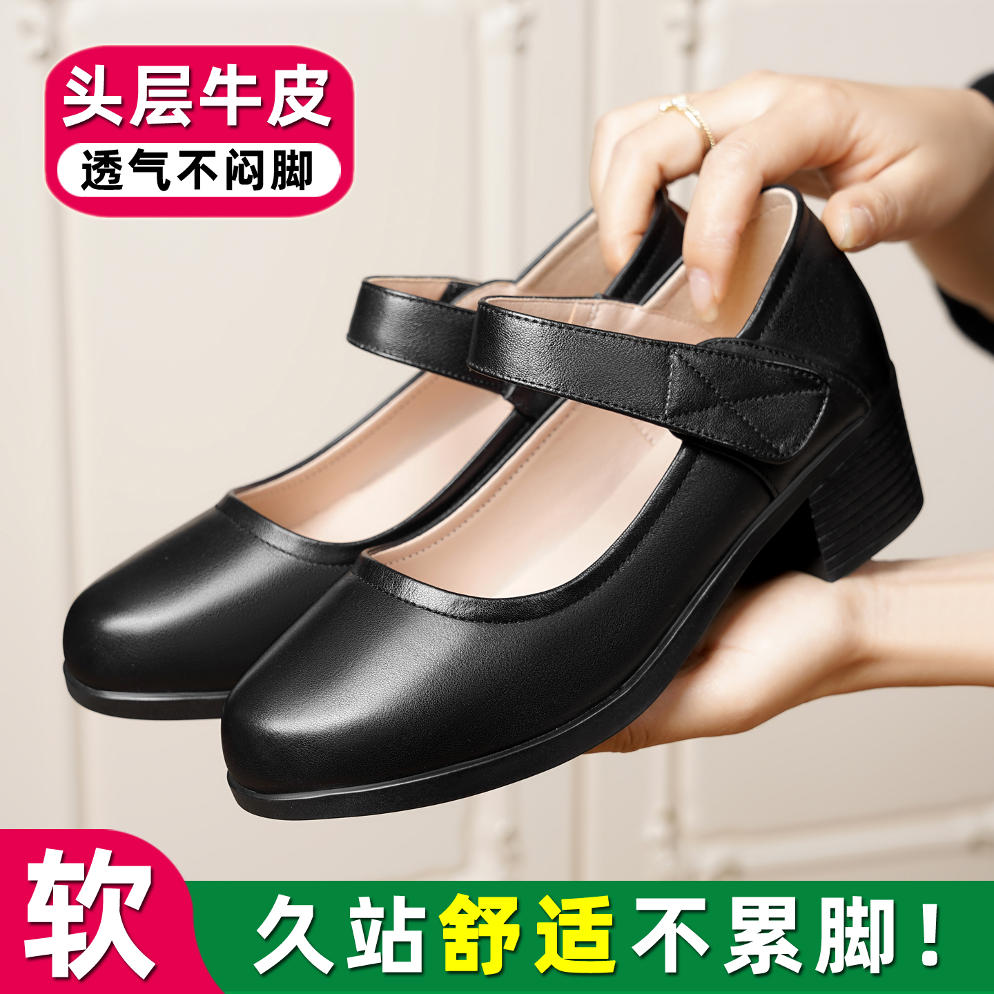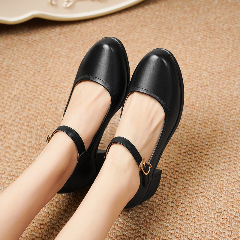女黑色皮鞋 女鞋 工鞋 软底职业大码 上班不累脚粗跟单鞋 一字扣工作鞋