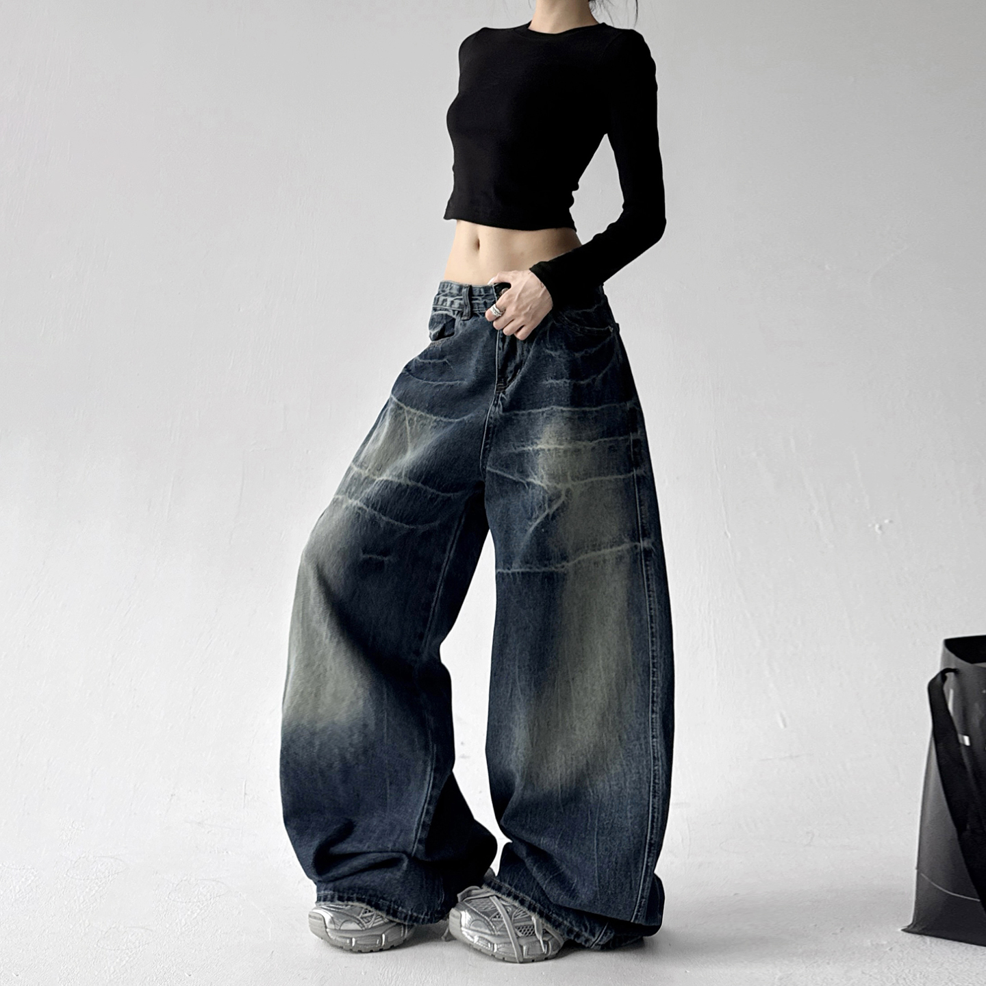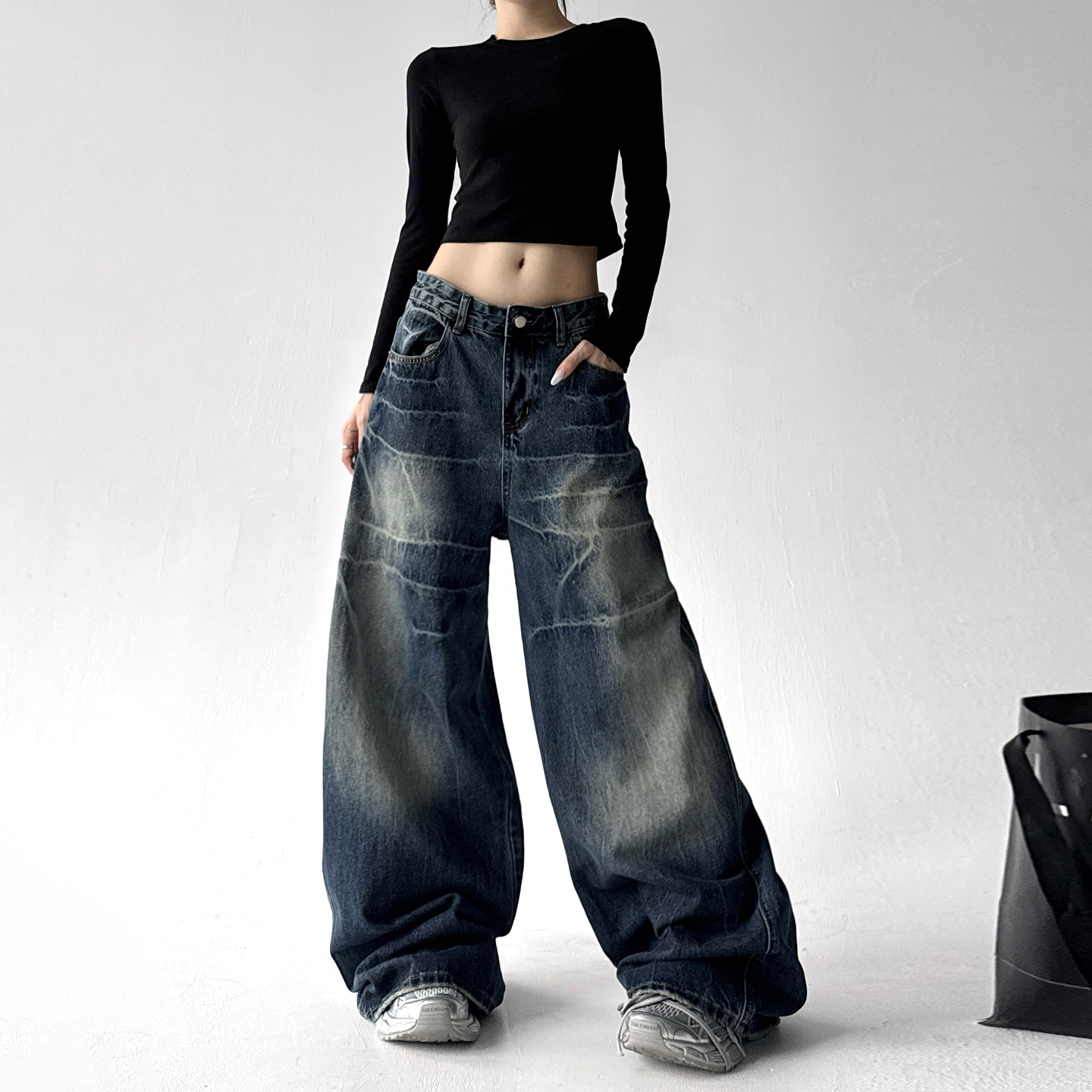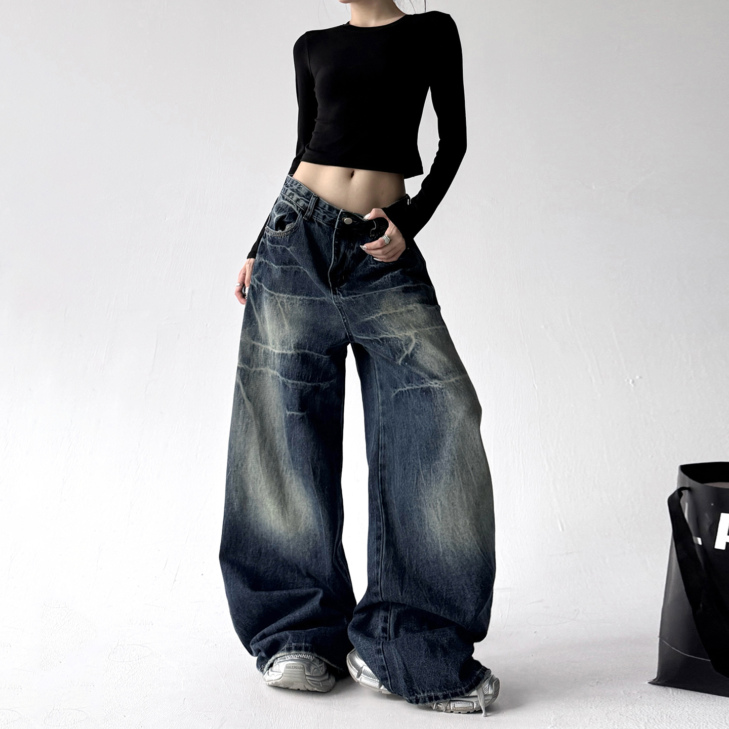 高腰直筒裤 梨型身材高个子秋季 女春秋2025新款 复古蓝色阔腿牛仔裤