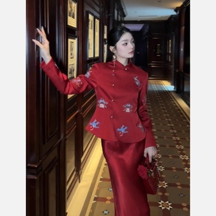 新中式 高端大气上档次国风缎面红色旗袍连衣裙秋 订婚敬酒礼服套装