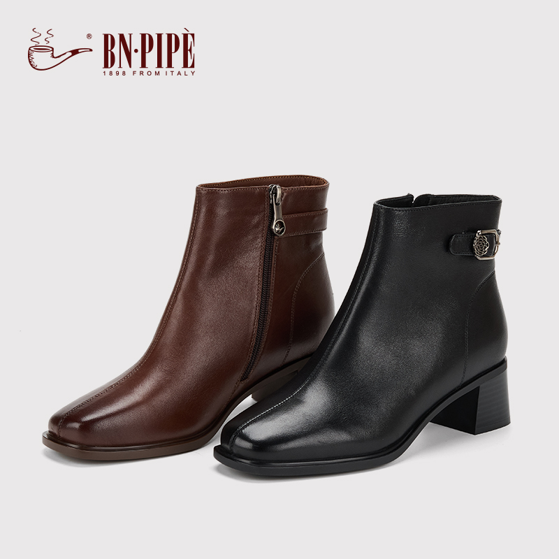 百年烟斗粗跟方头靴子女2025冬季 加绒短靴简约棕色舒适马丁靴 新款