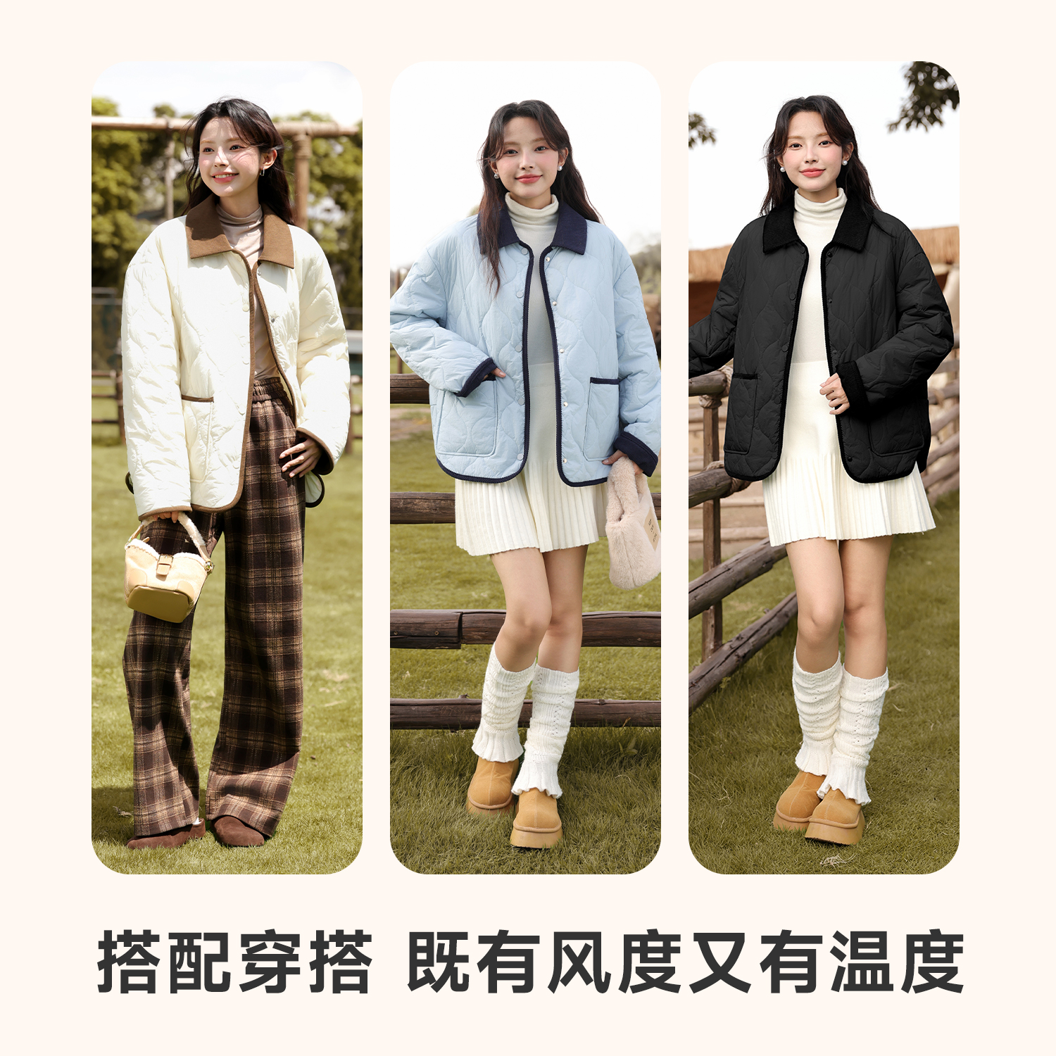 班尼路黑色绗棉翻领棉服女2025冬爆款 宽松休闲百搭棉衣外套N 韩版