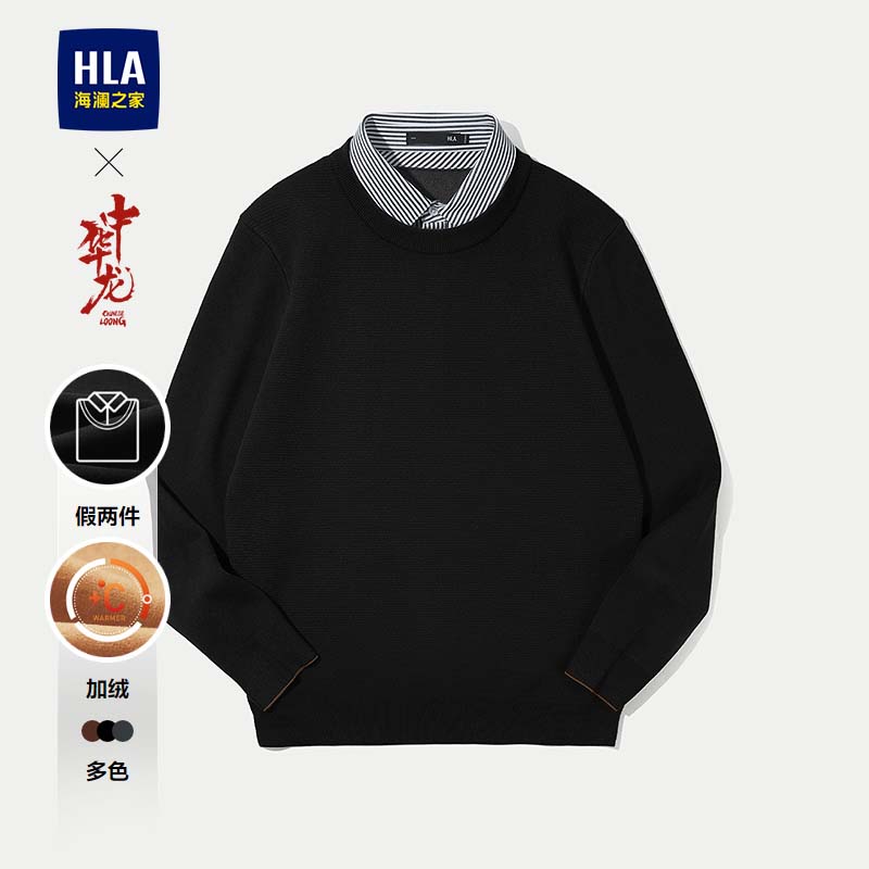 25秋冬新加绒假两件黑色毛衣男 双领针织衫 HLA 海澜之家中华龙长袖