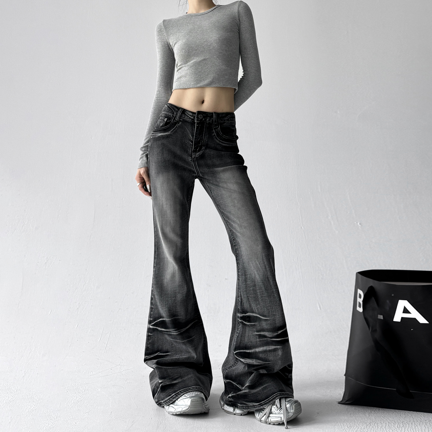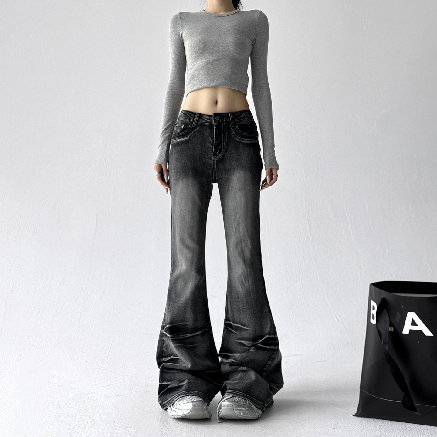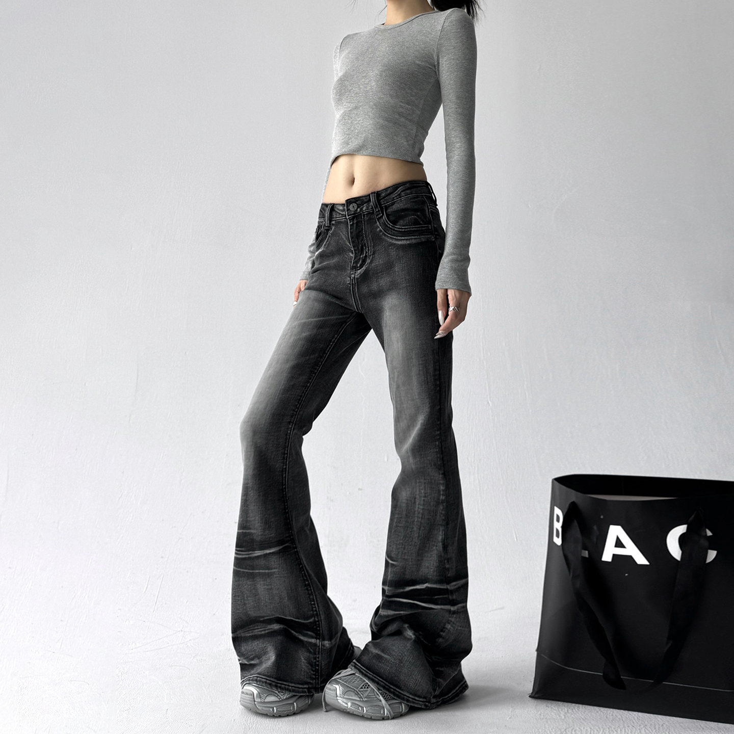 复古弯刀廓形烫钻字母LOGO标拖地牛仔裤 25早秋美式 GOOSE COLOR