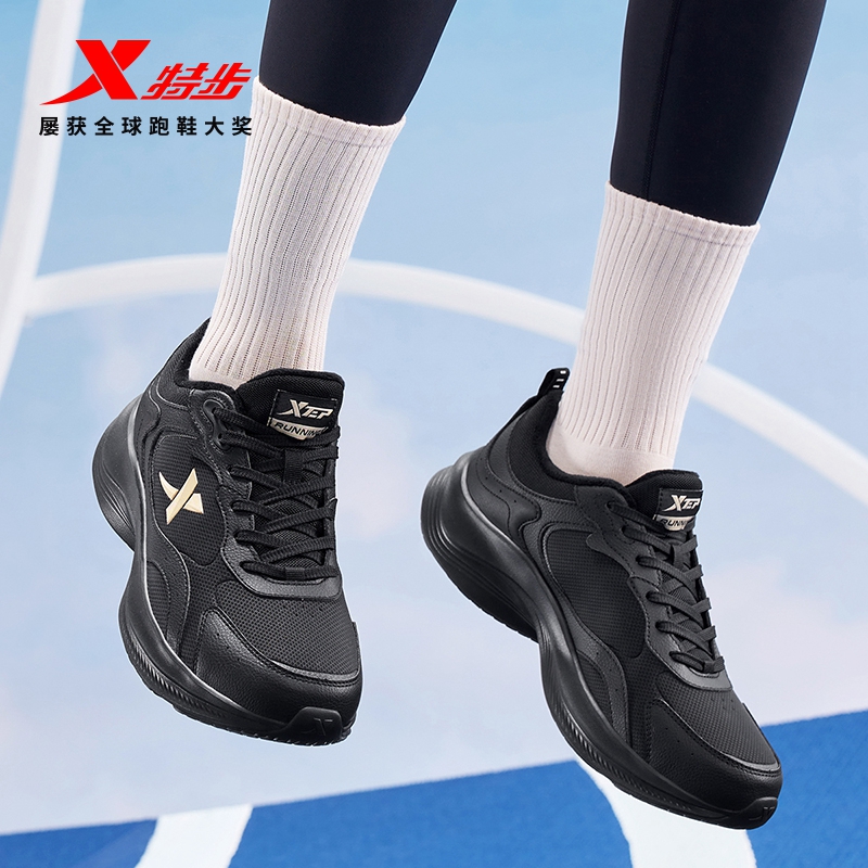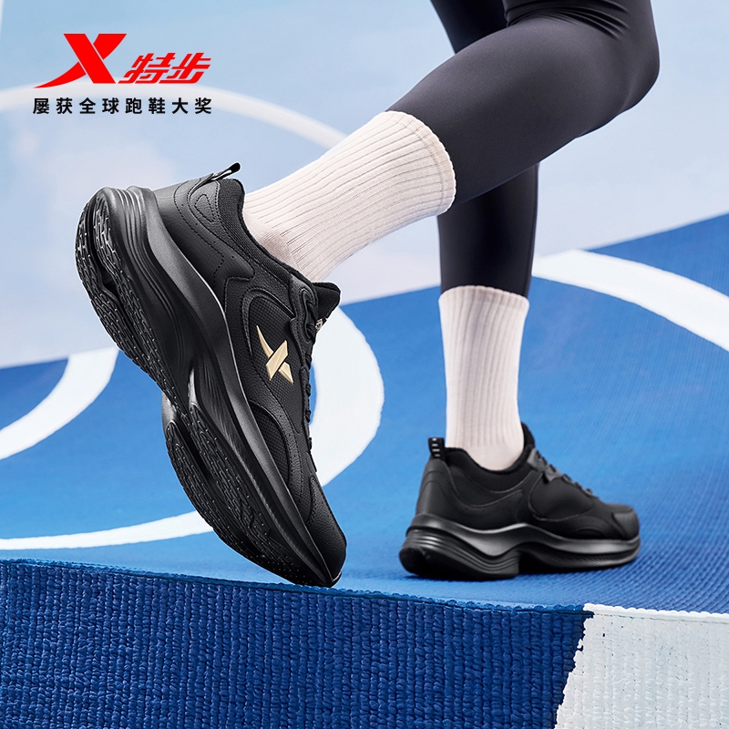轻便减震跑步鞋 男加绒棉鞋 皮面防水爸爸保暖黑色运动鞋 特步男鞋