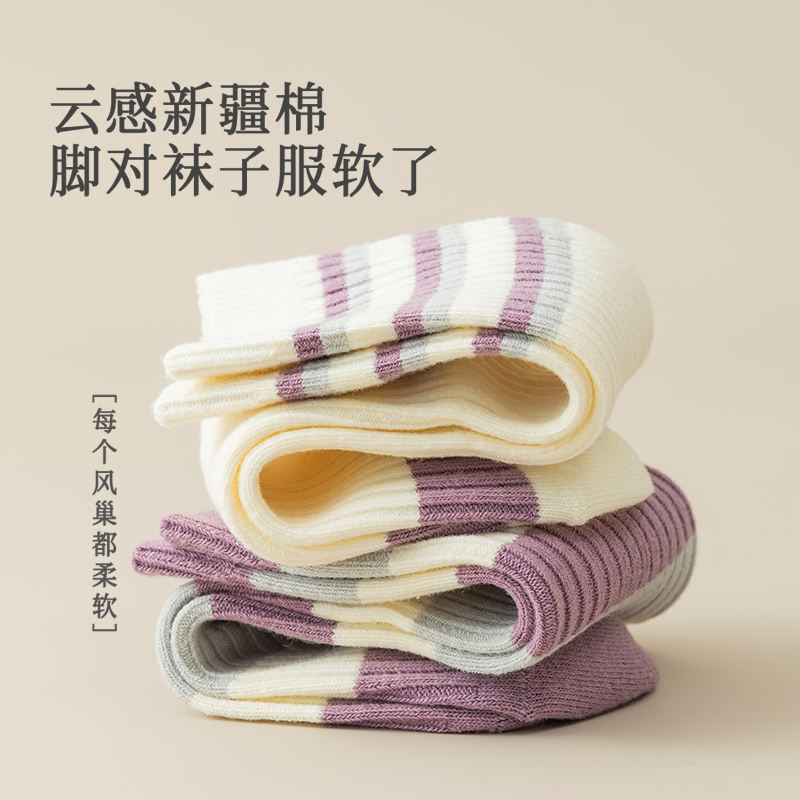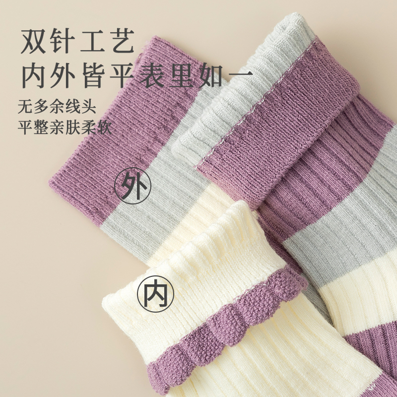 双针袜子女款 女士透气长筒袜 纯棉紫色春秋拼色条纹中筒袜2025新款