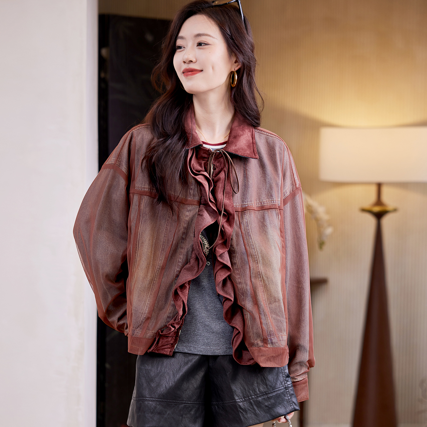 宝诗黎网纱拼接牛仔短外套2025秋季 洋气宽松百搭休闲设计感女装