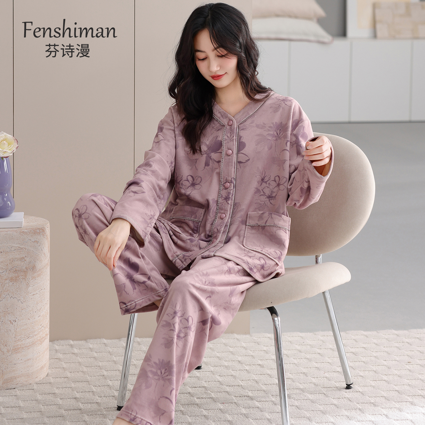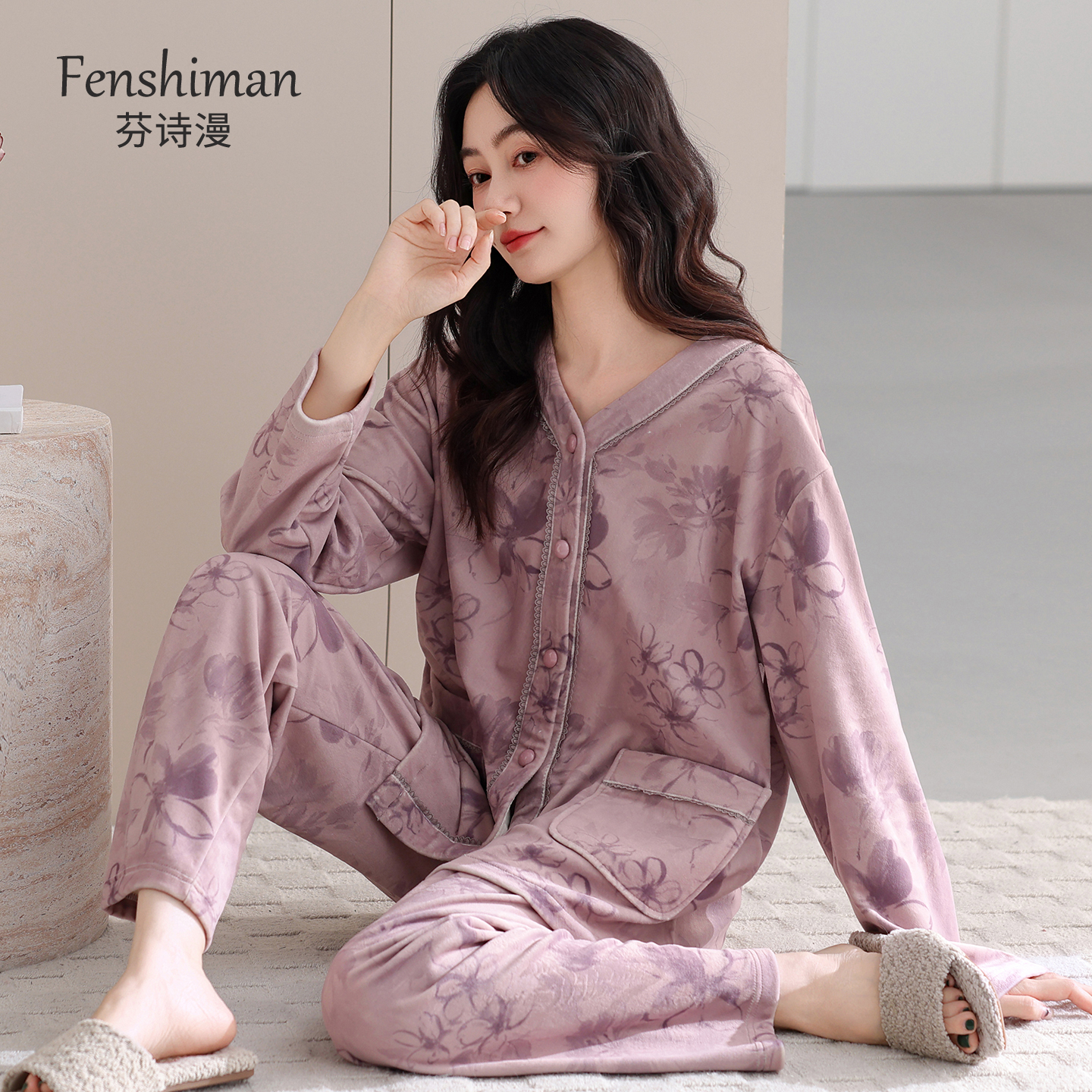 睡衣女士冬季 珊瑚绒加厚加绒海岛绒秋冬中老年妈妈春秋薄绒家居服