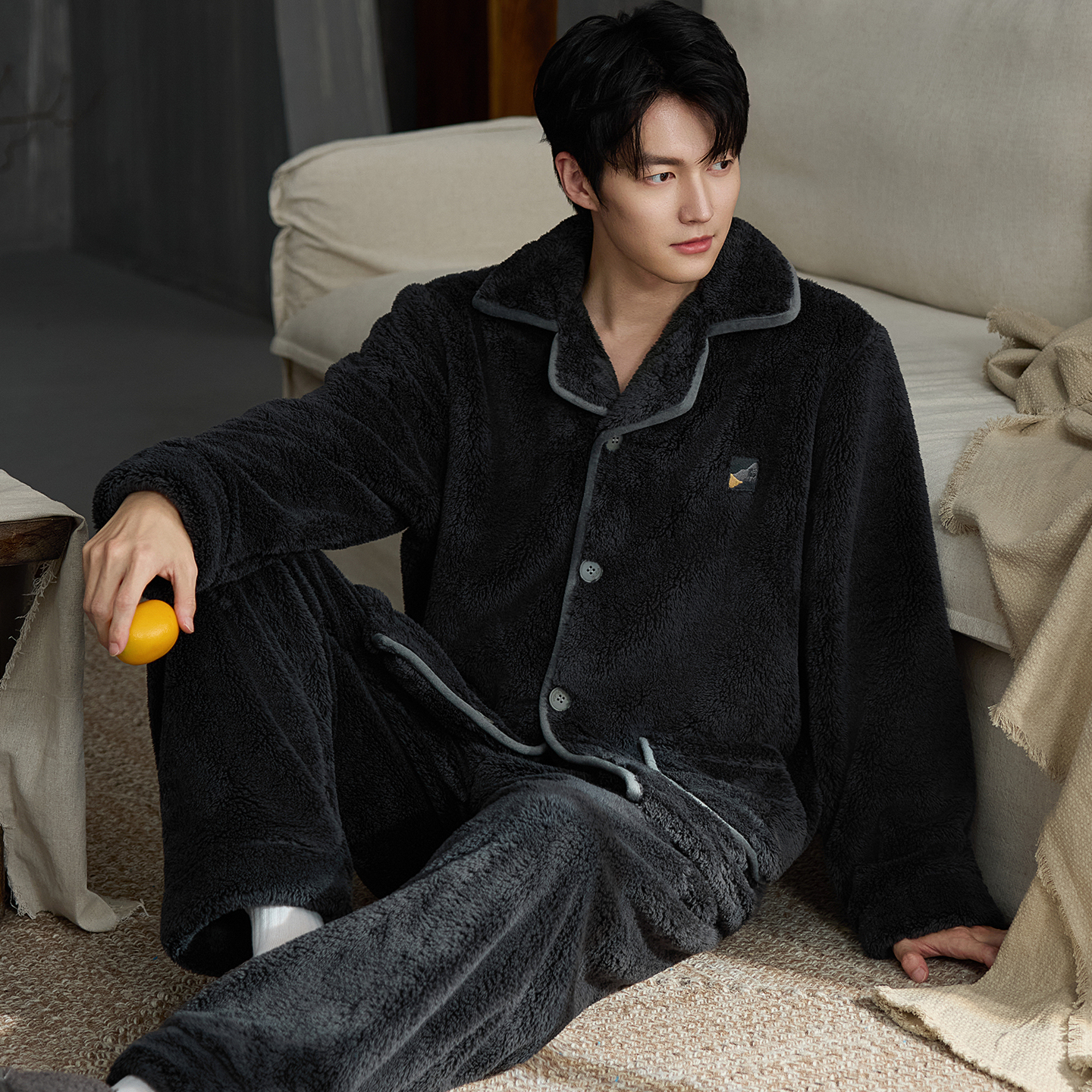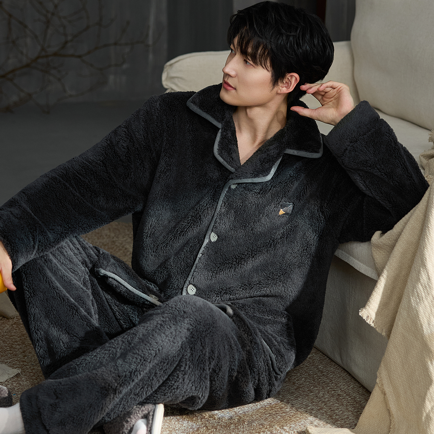 睡衣保暖家居服套装 三层夹棉袄男士 可外穿 珊瑚绒加厚加绒款 秋冬季