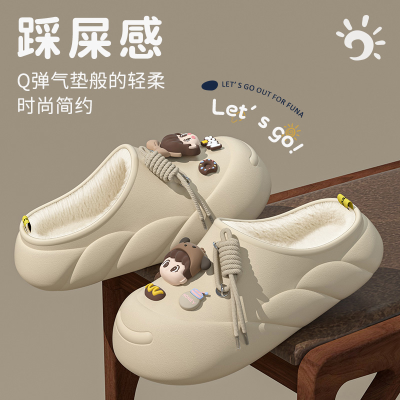 加绒防水棉拖鞋 保暖厚底棉拖外穿全包室内 女EVA秋冬防滑秋冬季