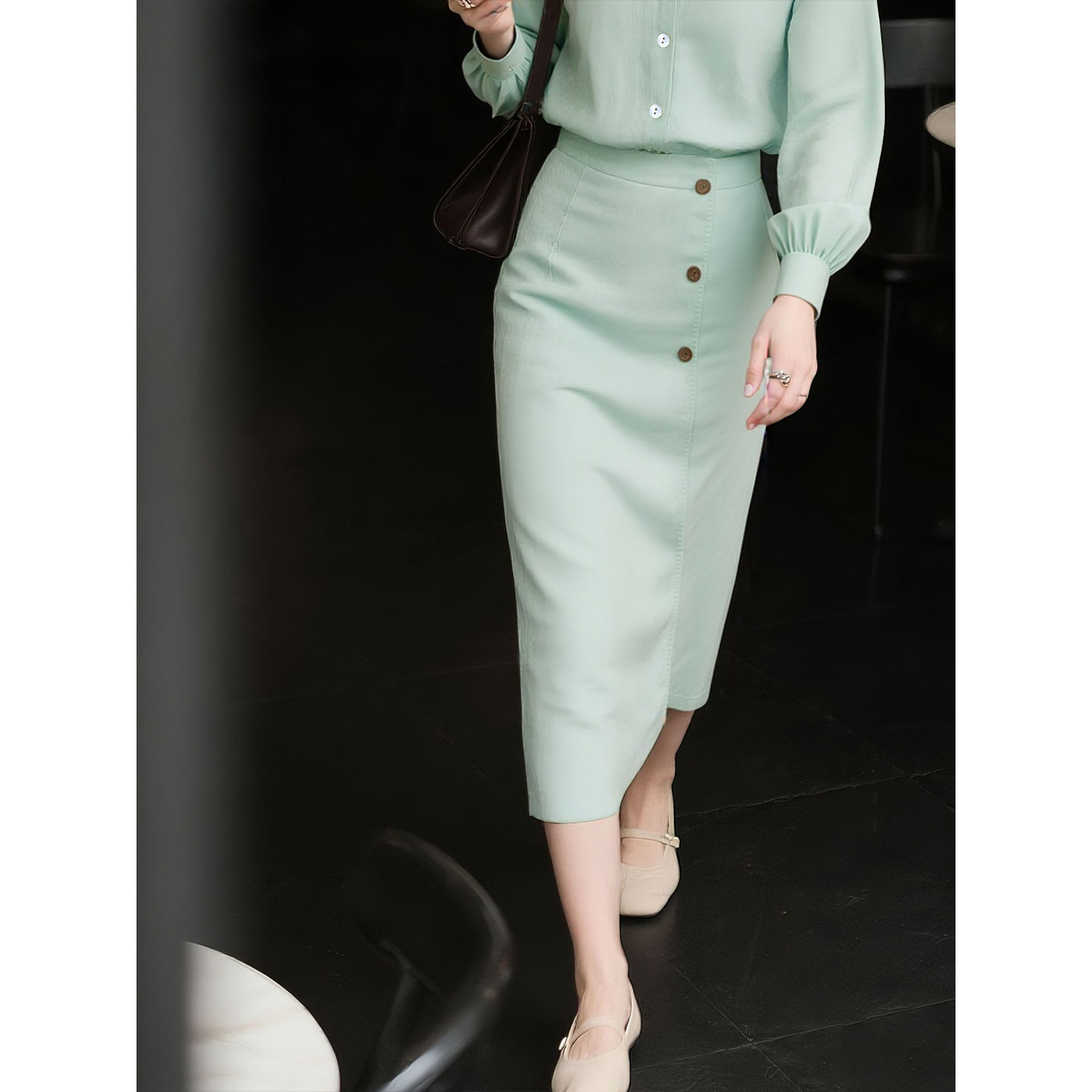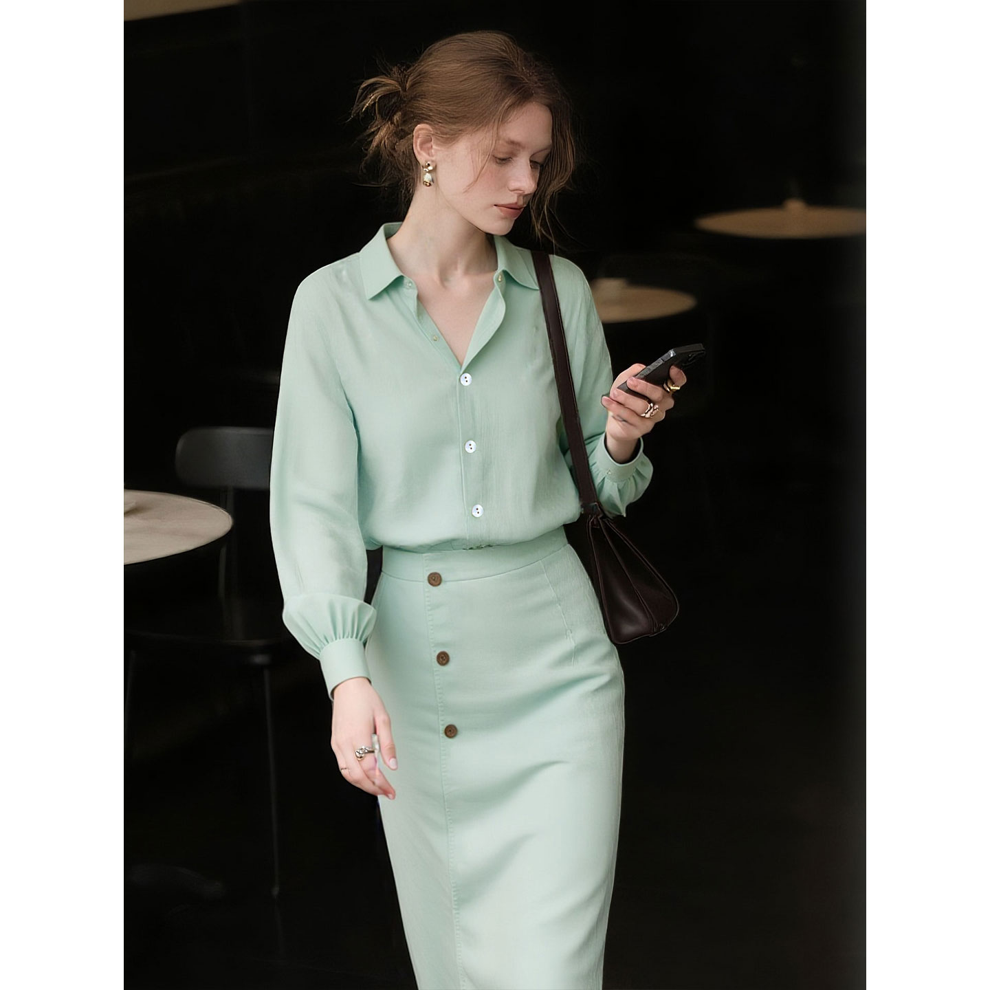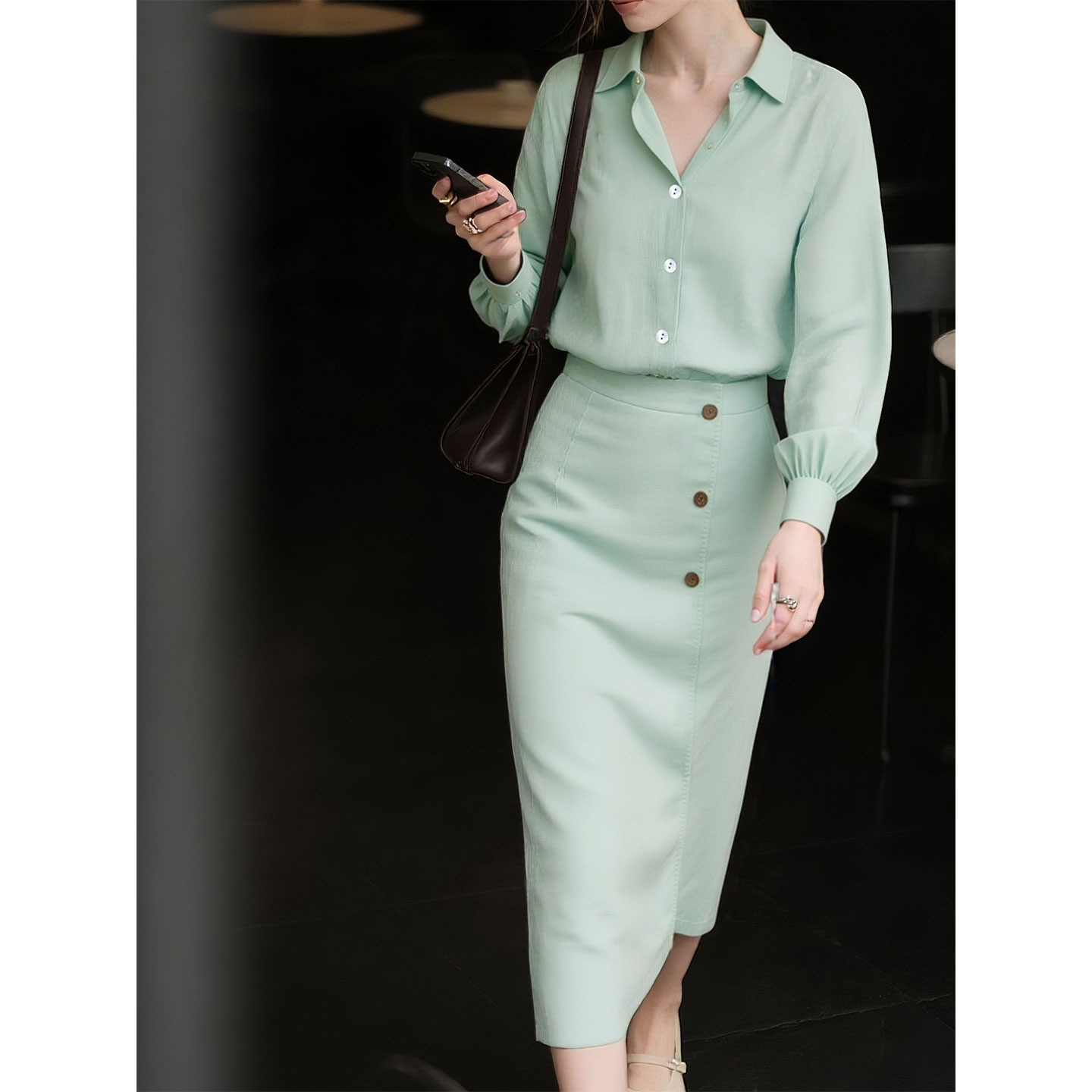 半身裙两件套巨好看 绿色套装 衬衫 新款 早秋一整套 裙女2025年秋季
