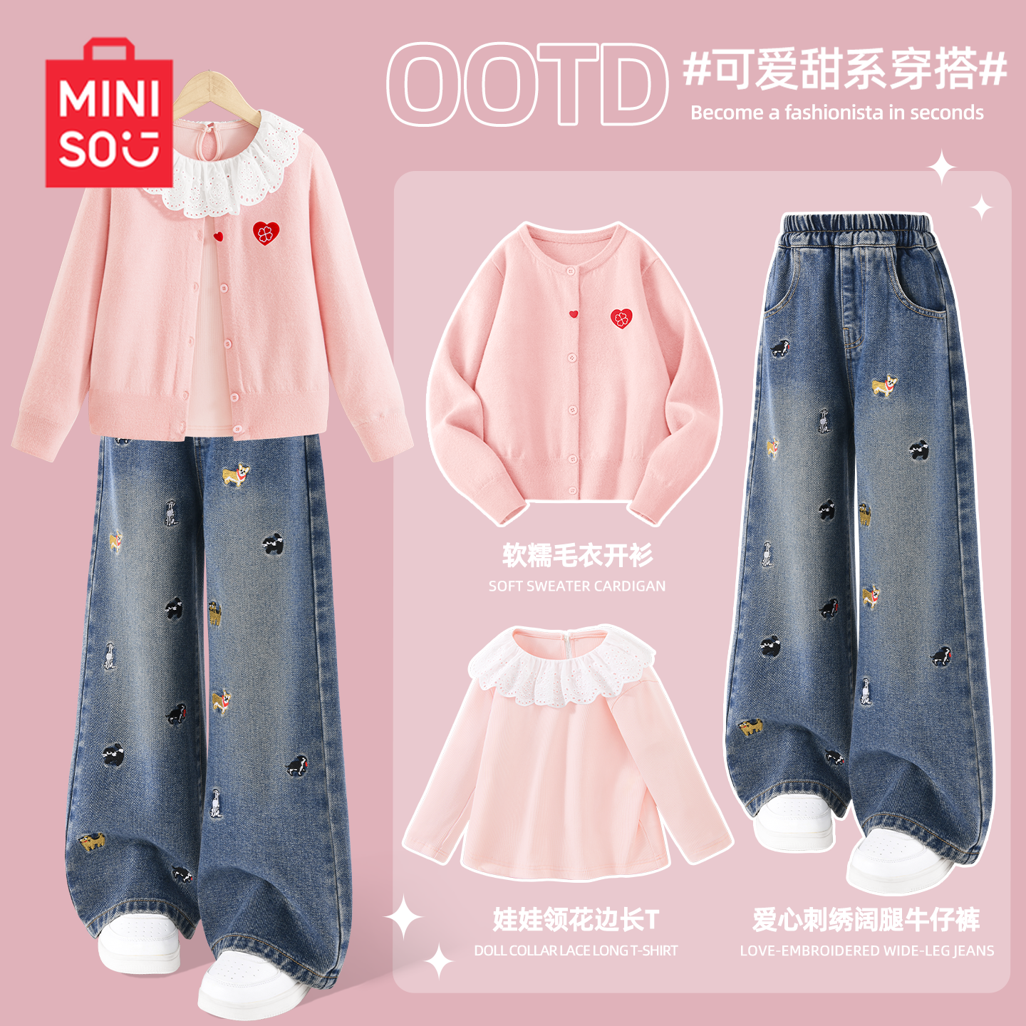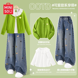 2025新款 套装 毛衣春秋款 花边T恤儿童秋季 牛仔裤 名创优品女童秋装