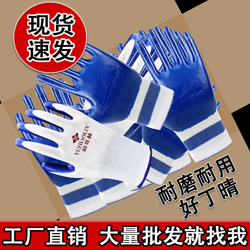加厚防护手套蓝白耐磨丁腈透气工地防滑机械劳动维修干活批发耐用