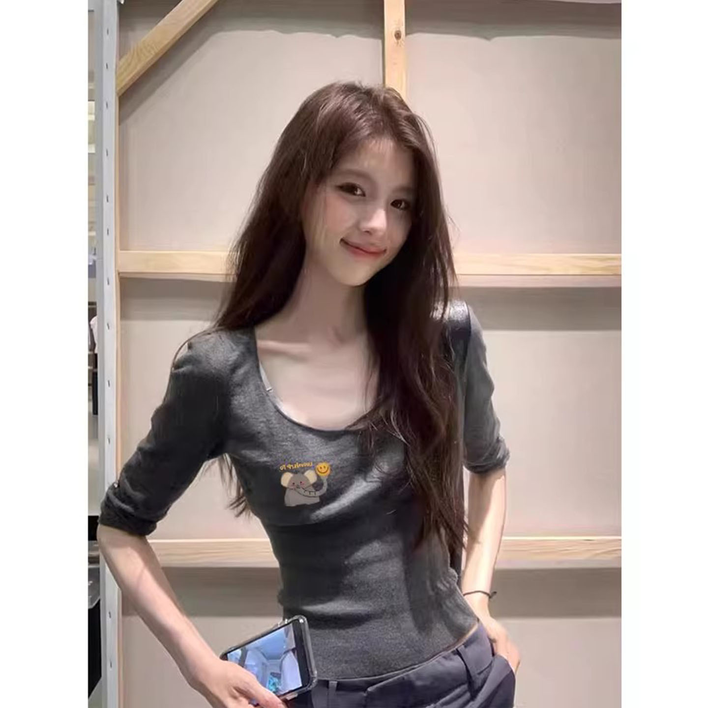 显瘦辣妹小众超好看上衣 修身 韩系灰色气质长袖 T恤女2025早秋新款