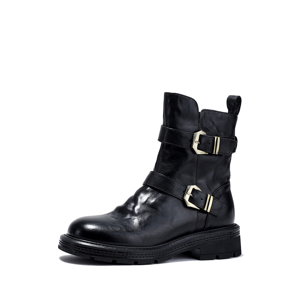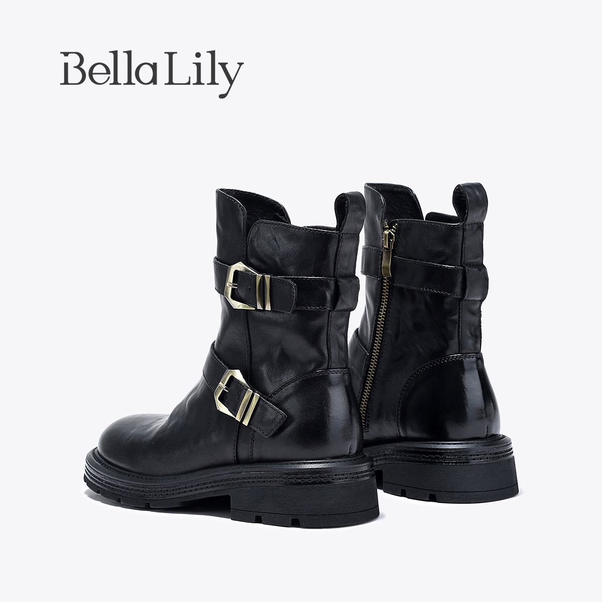 BellaLily2025秋冬新款 靴复古牛皮中筒靴女皮带扣瘦瘦靴 气质时装