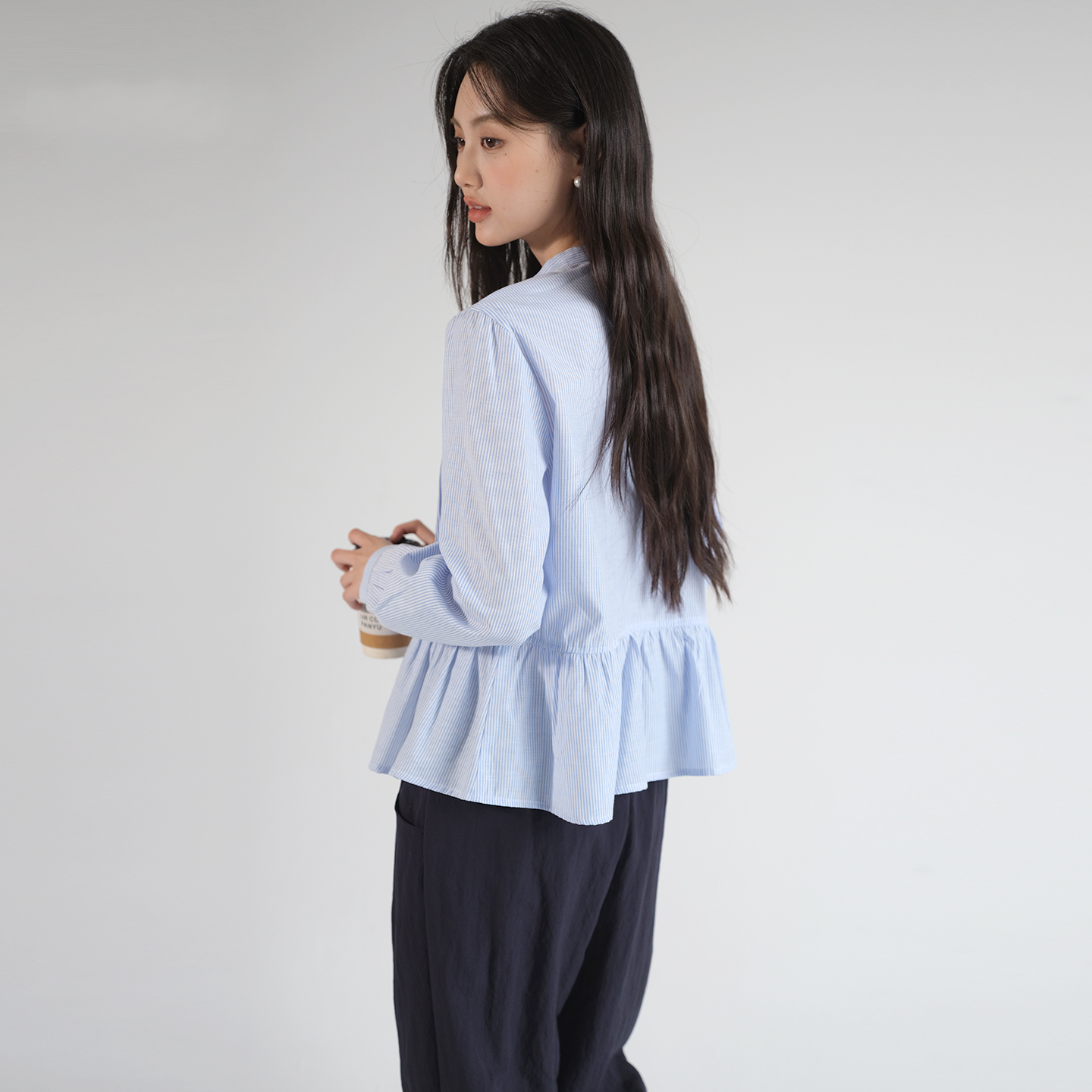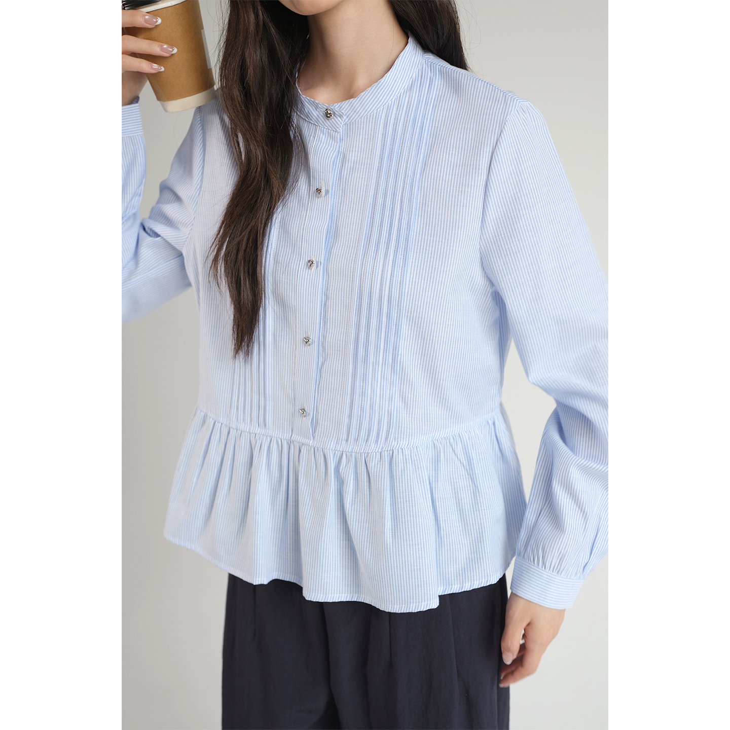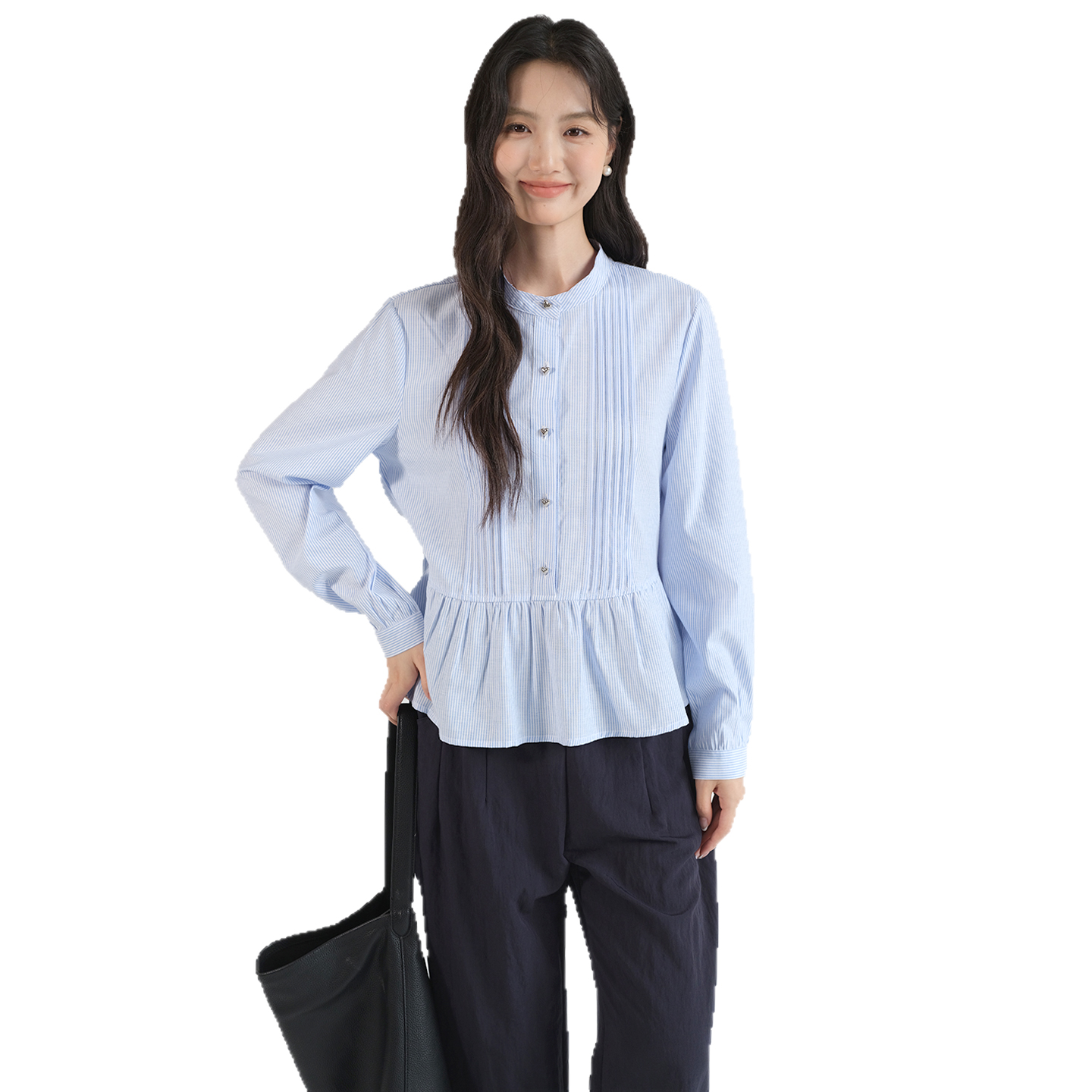 条纹立领风琴褶衬衫 时尚 蓝若水大码 新款 气质甜美上衣 2025秋装