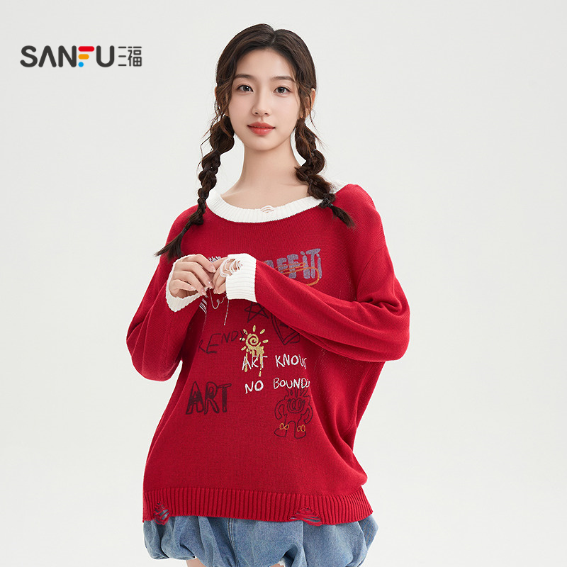 三福套头毛衣2025秋季 507680 慵懒风涂鸦图案破洞撞色圆领上衣女装