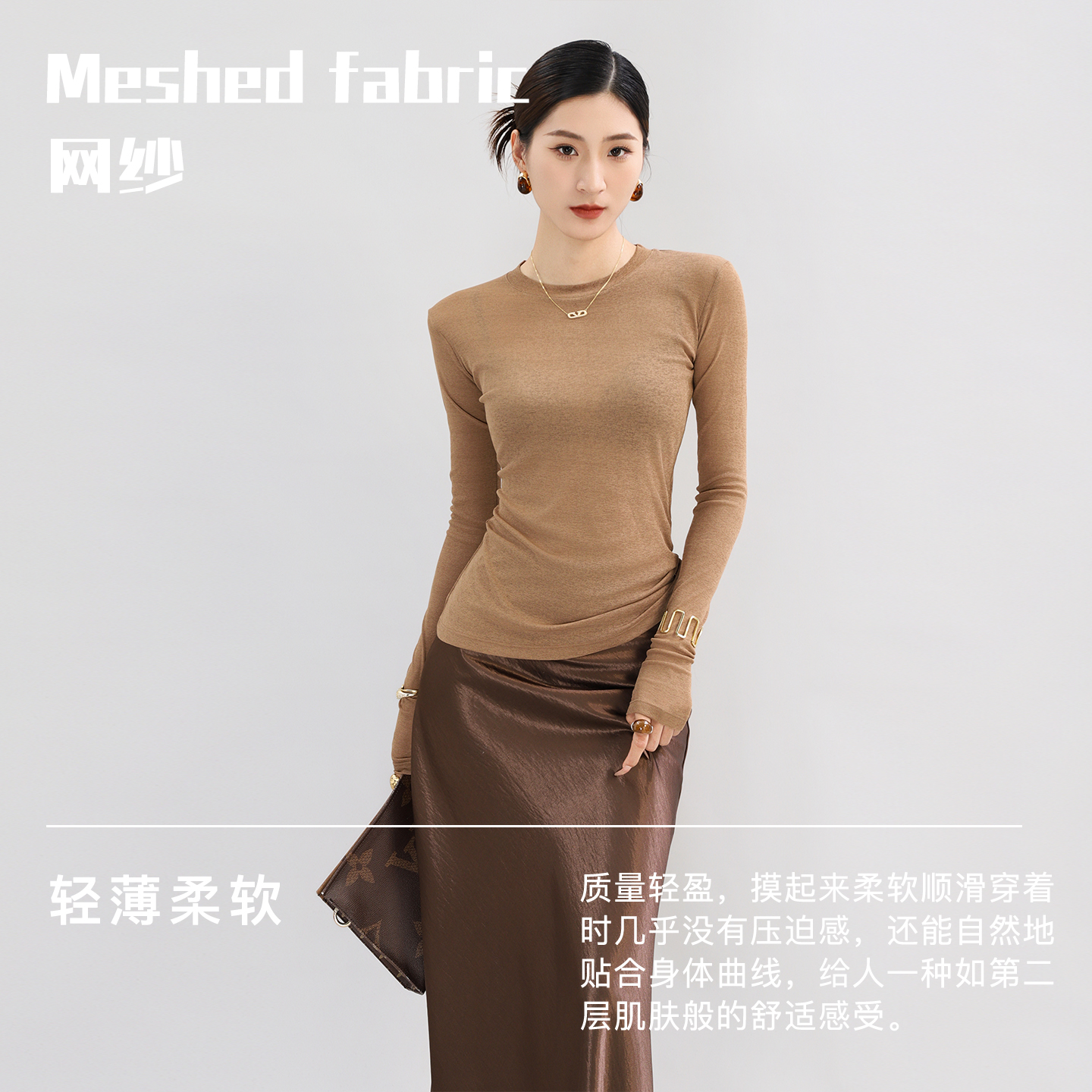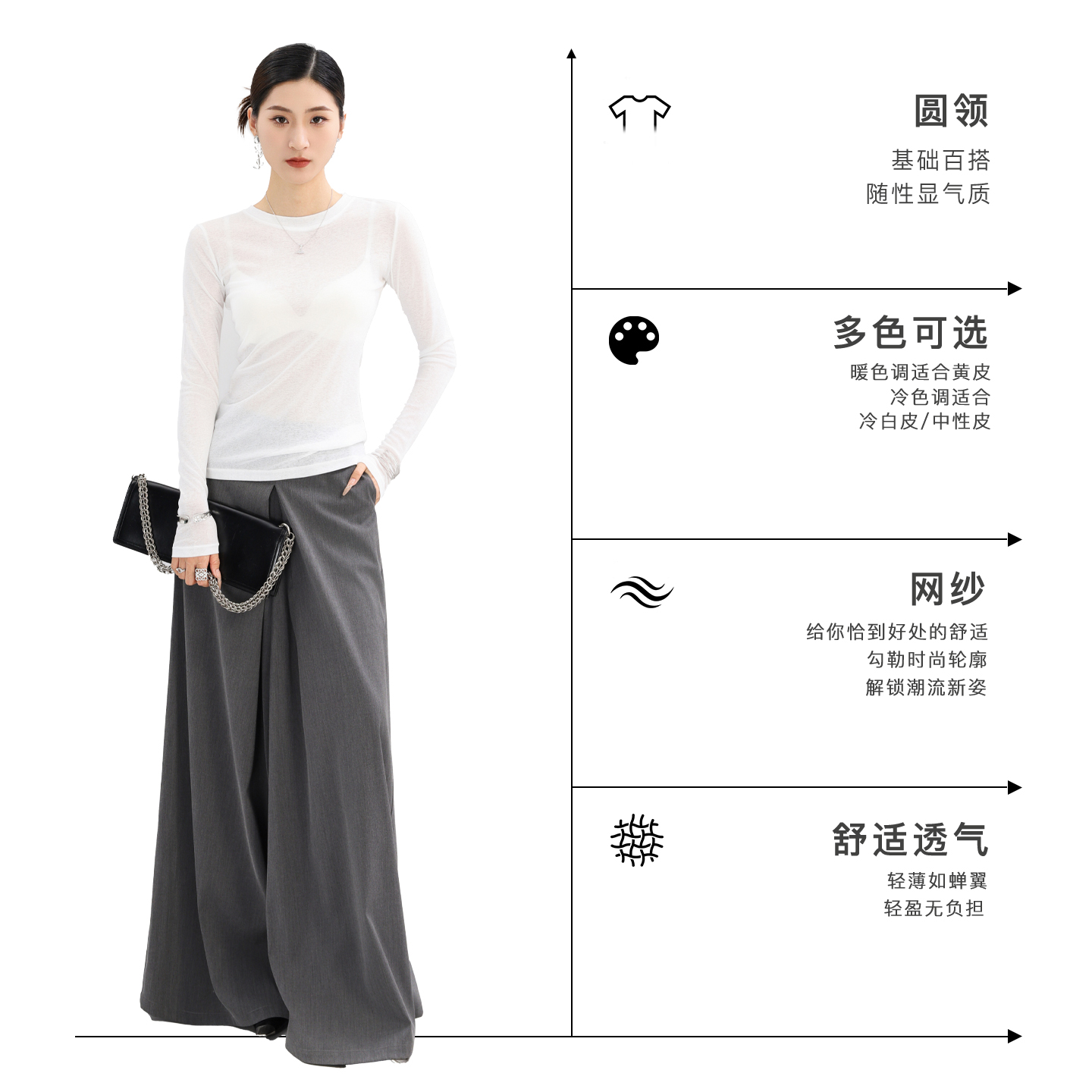 网纱上衣轻奢高级感透视薄 蕾丝叠穿修身 黑色打底衫 女内搭圆领长袖