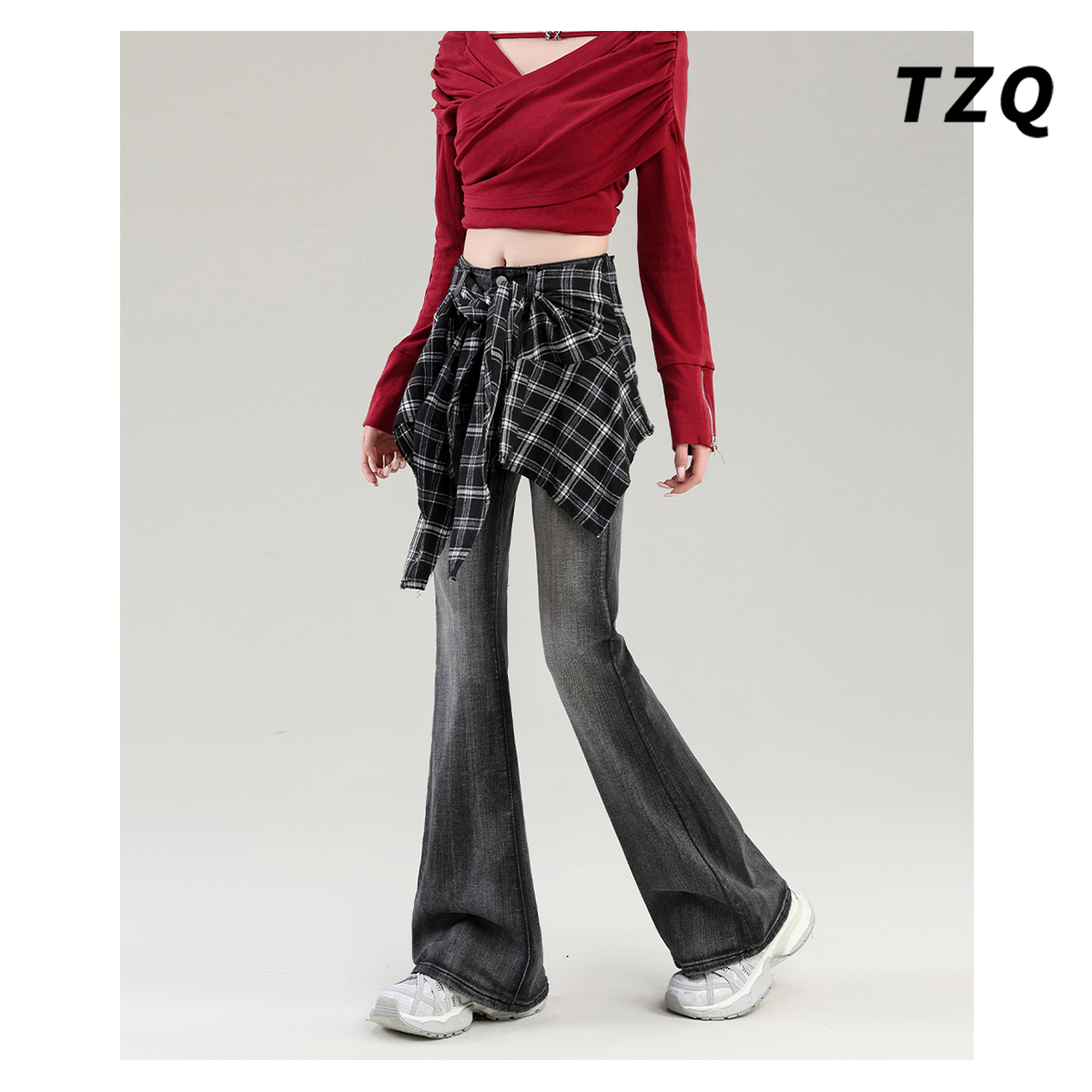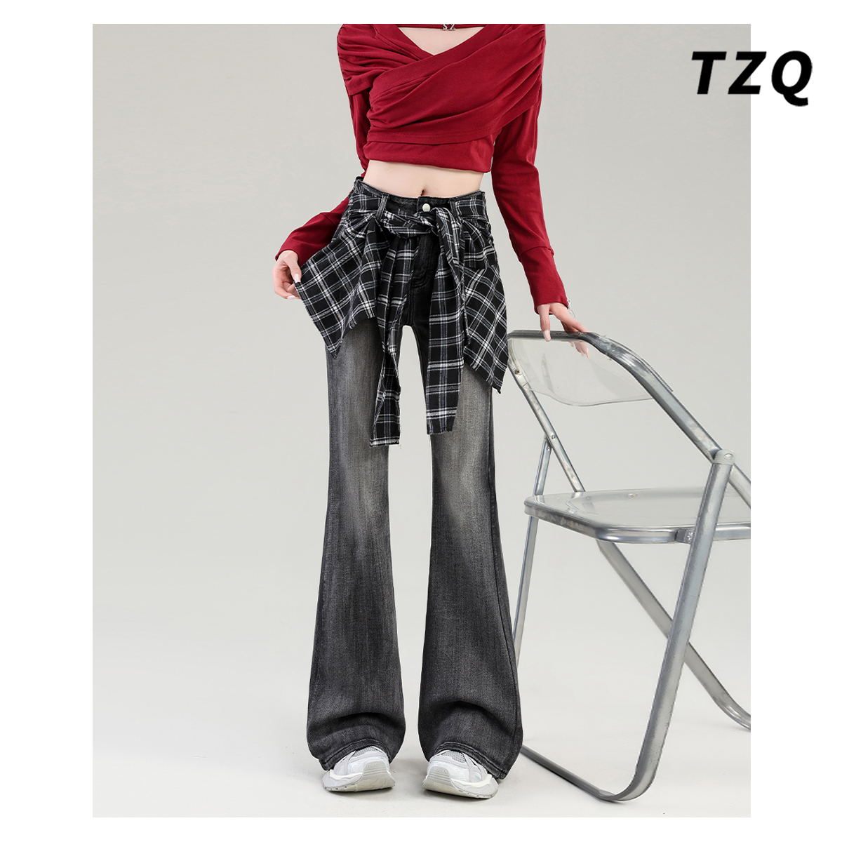 女高腰显瘦宽松加绒气质喇叭裤 复古蓝微喇阔腿牛仔裤 新款 乔栈秋季