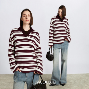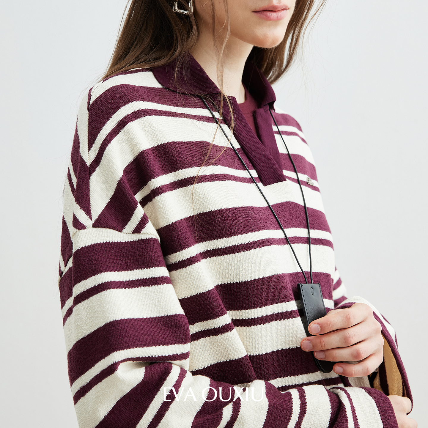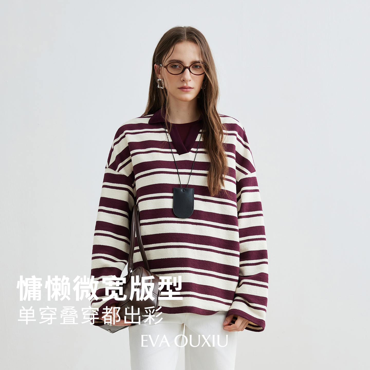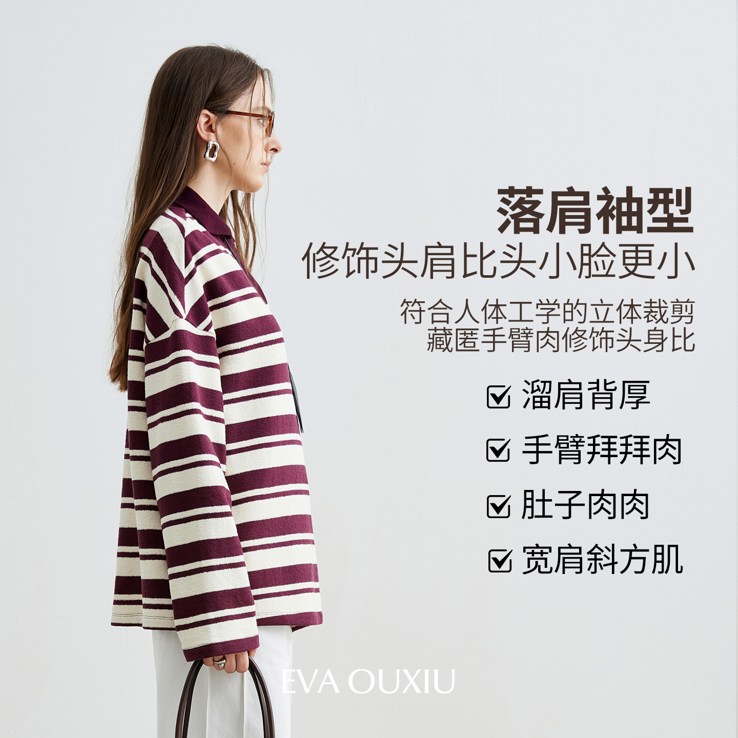 EVAOUXIU女士简约休闲全棉Polo领条纹长袖 宽松廓形上衣 T恤25秋季