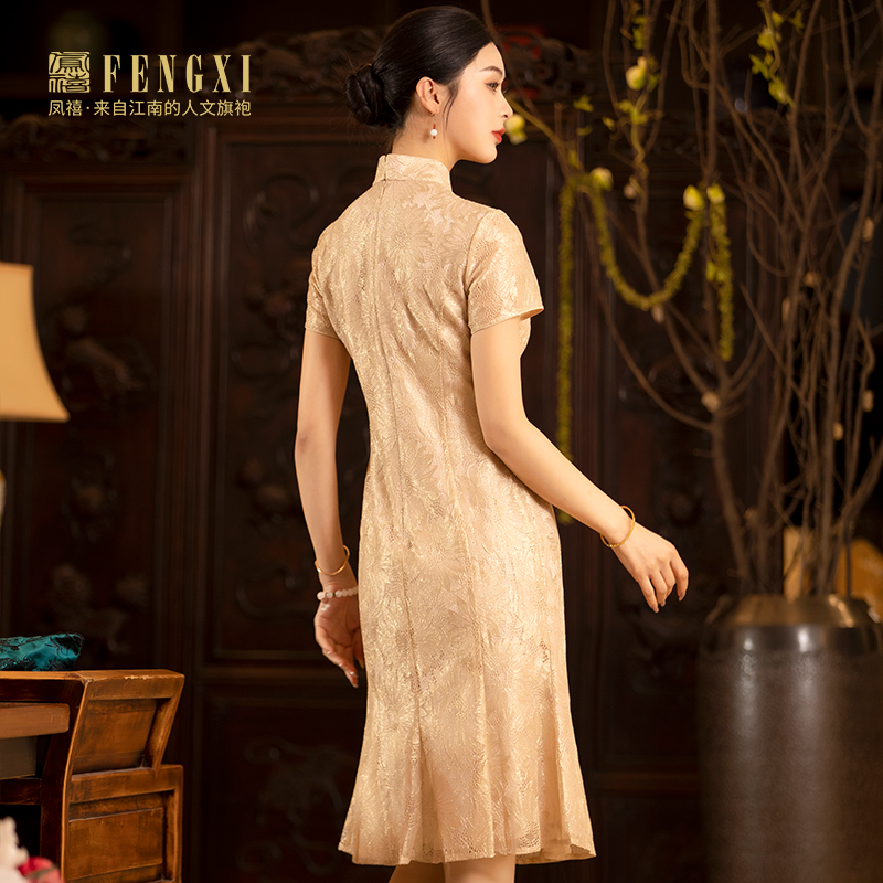 凤禧金色中式 鱼尾蕾丝日常宴会两用旗袍原创订婚礼服裙2025新款
