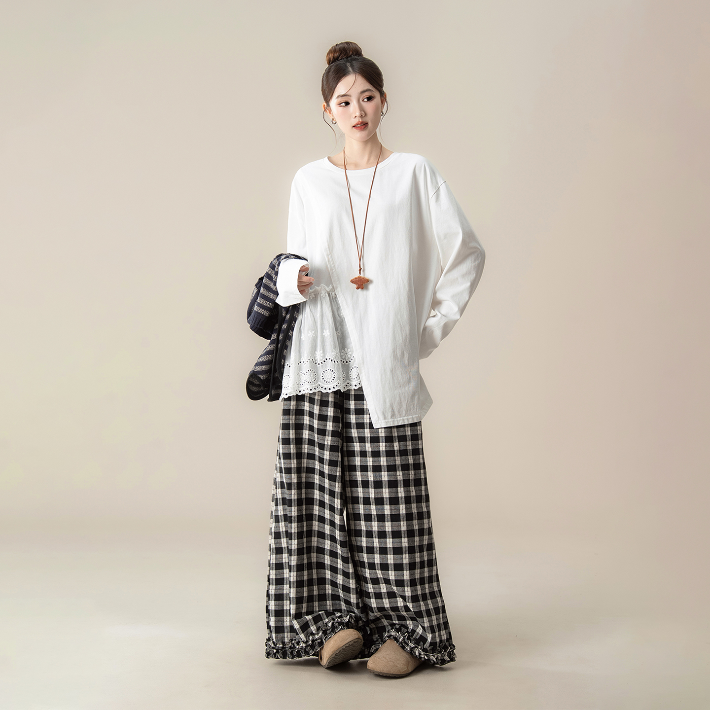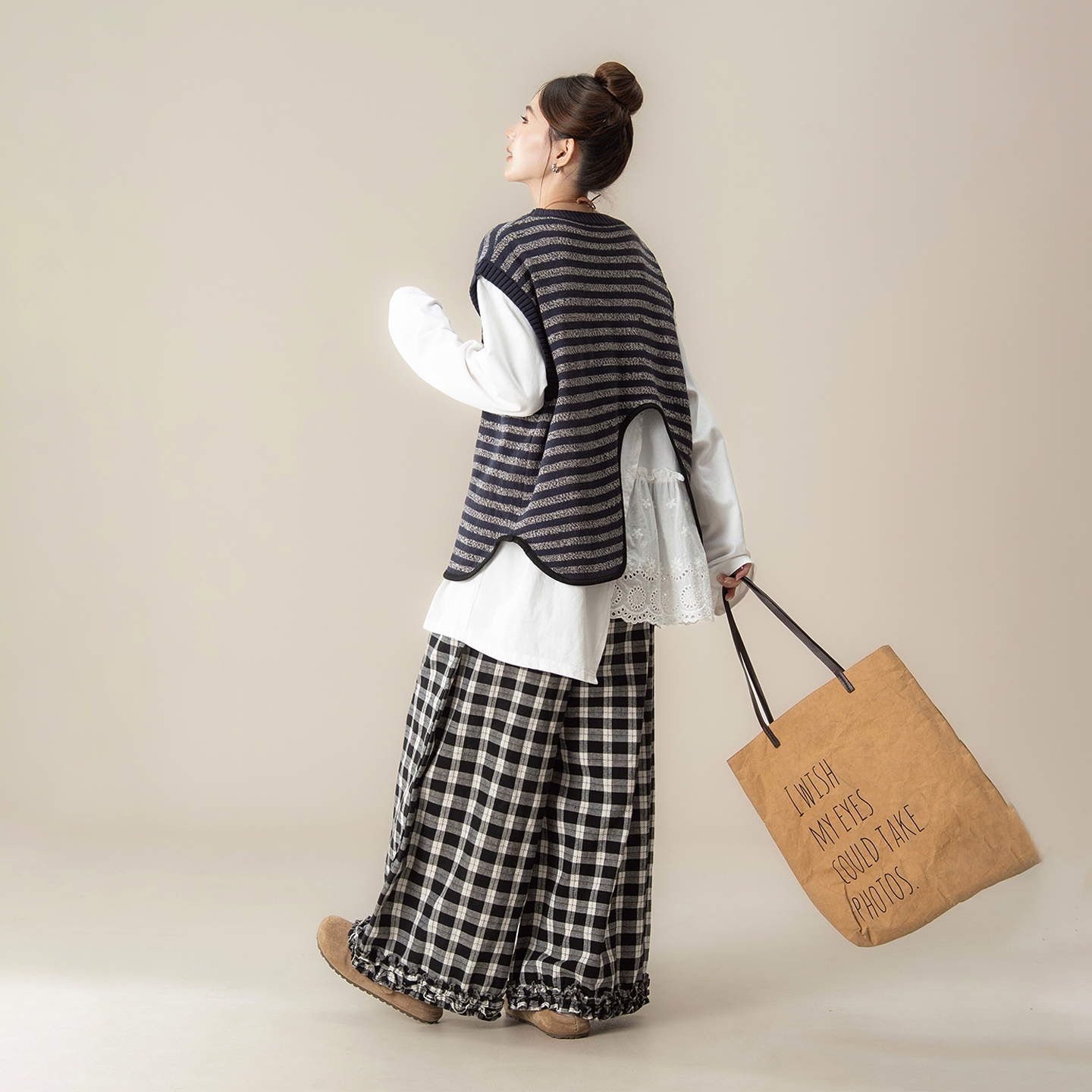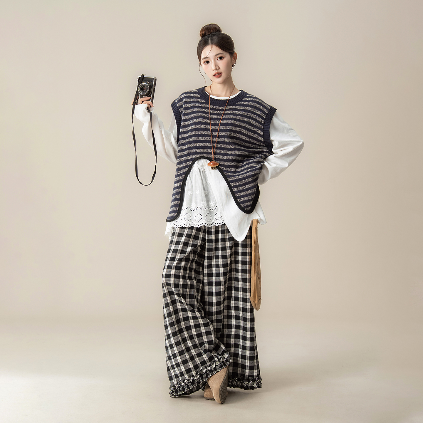 新款 女秋季 韩系减龄马甲宽松上衣 针织衫 藏蓝色不规则条纹圆领无袖