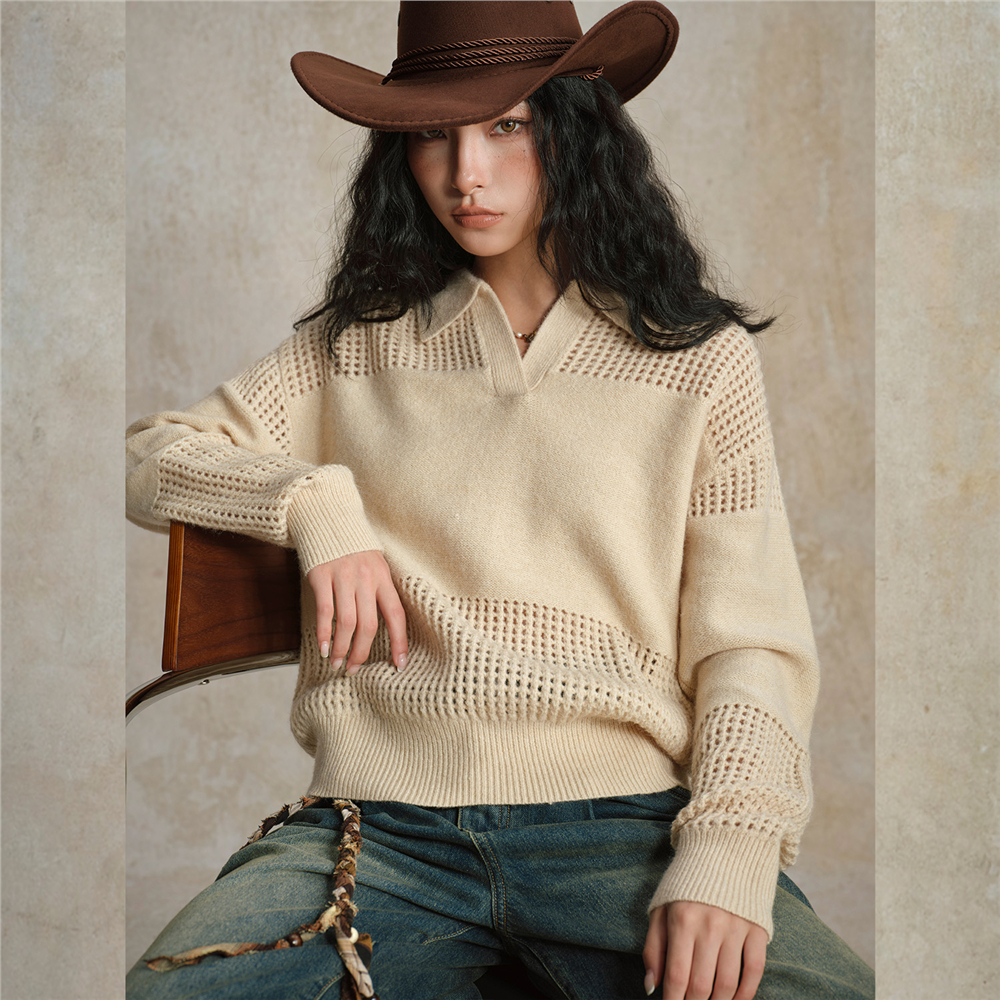 拼接镂空宽松V字翻领针织衫 秋冬新款 18355819 佐丹奴女装 设计师款