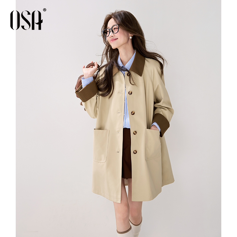 撞色翻领休闲外套 新款 OSA欧莎复古卡其色风衣女中长款 2025年秋季