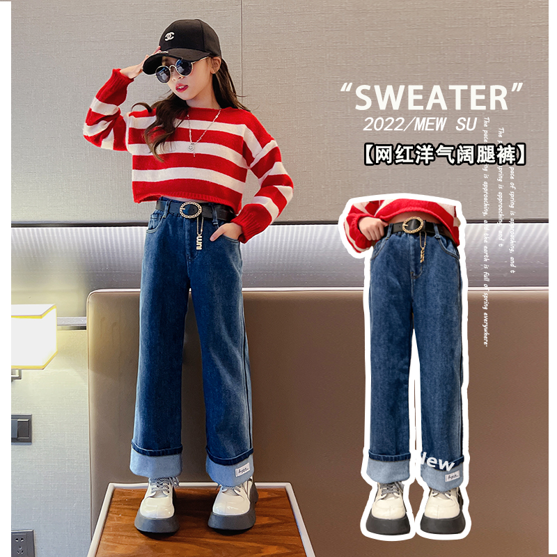 儿童潮流款 女童裤 休闲时髦百搭阔腿裤 春秋女宝宝牛仔裤 子2025新款