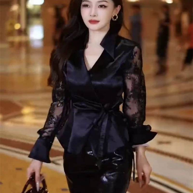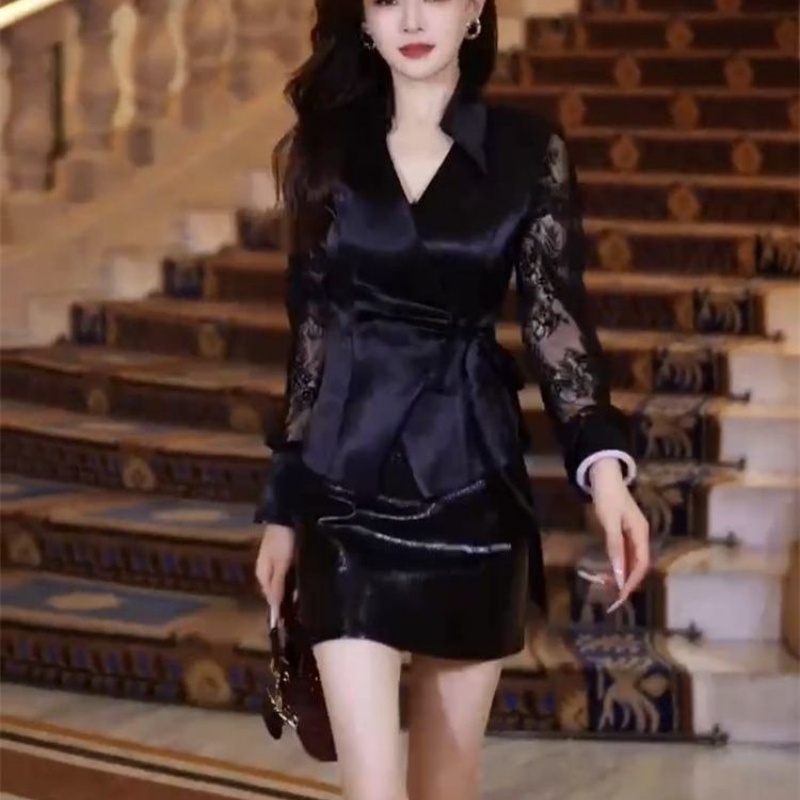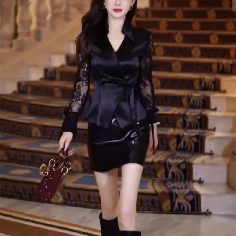 U皮裙两件套 裙女性感蕾丝拼接系带显瘦衬衫 2025新款 早秋网红时尚