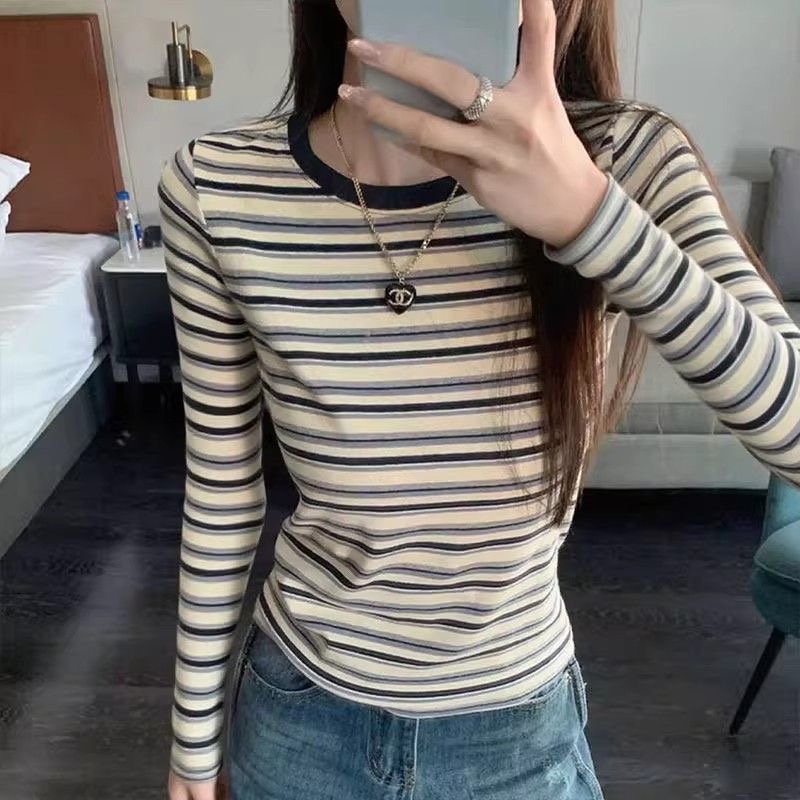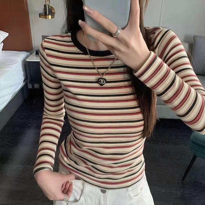 显瘦打底衫 复古修身 上衣女 t恤女秋冬美式 设计感撞色条纹圆领长袖