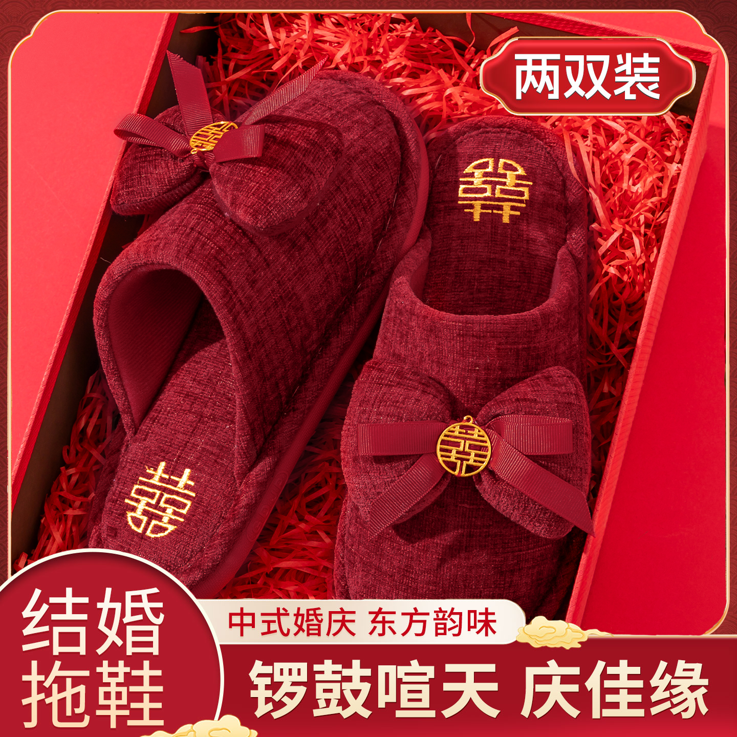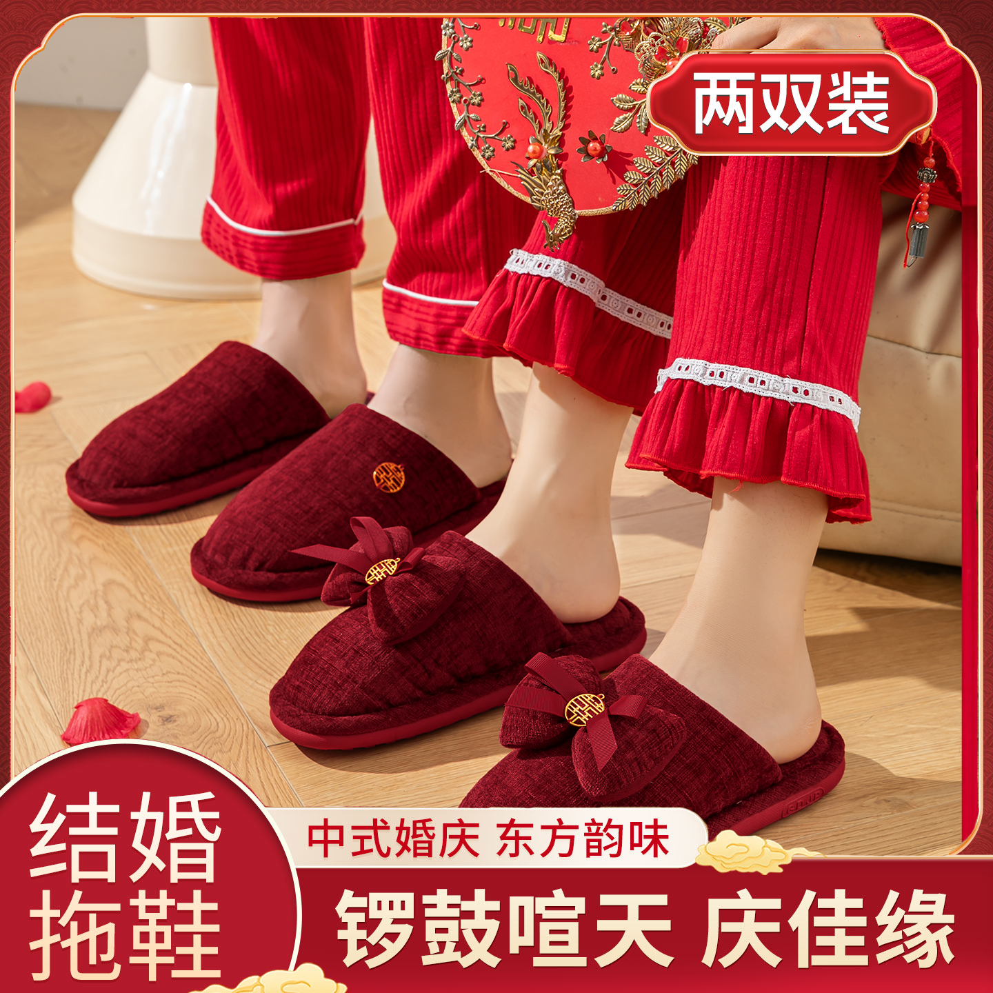喜事拖鞋 婚鞋 结婚一对轻奢感新婚喜庆新娘晨袍陪嫁鞋 红色情侣拖鞋