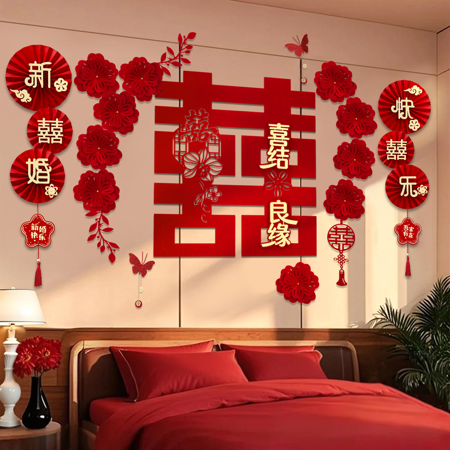 结婚卧室床头装 男方客厅女方新房背景墙贴 饰拉花喜字婚房布置套装