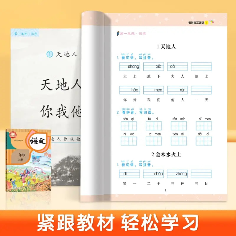 一年级上册语文同步生字组词造句本看拼音写词语基础知识专项训练题小学生看拼音写词语生字注音组词拼音专项训练人教版 同步练习册