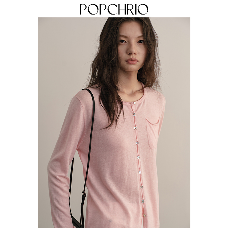 女 针织开衫 POPCHRIO欧可芮 慵懒风宽松卷边真丝羊毛毛衣圆领长袖