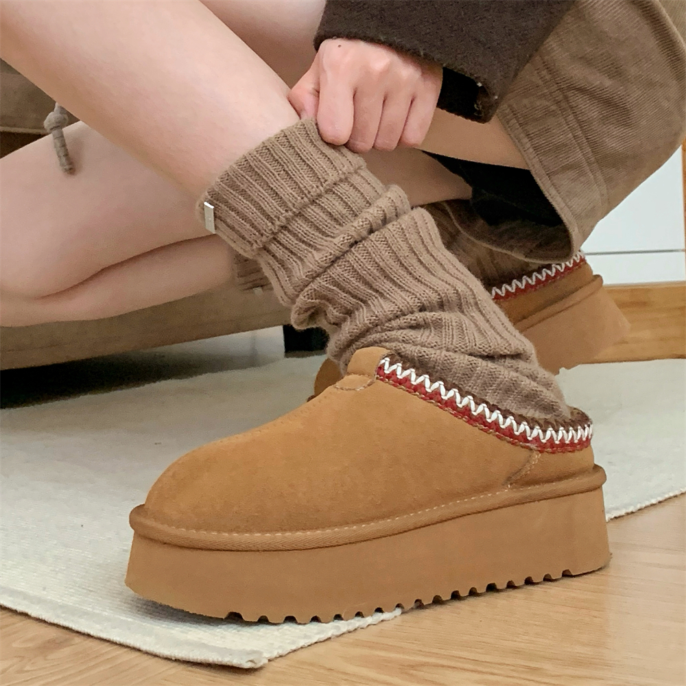 防滑半拖鞋 加绒保暖女冬季 复古民族风刺绣真牛皮羊毛棉鞋 细细条