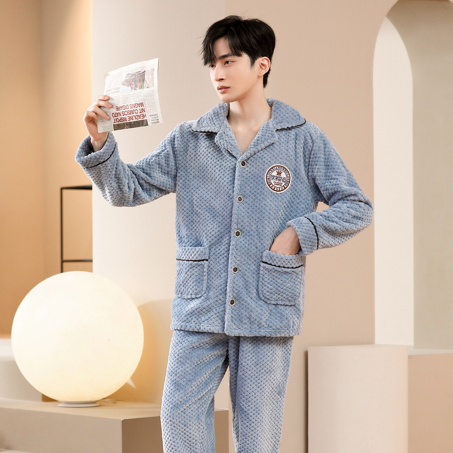 睡衣保暖家居服套装 三层夹棉袄男士 可外穿 珊瑚绒加厚加绒款 秋冬季